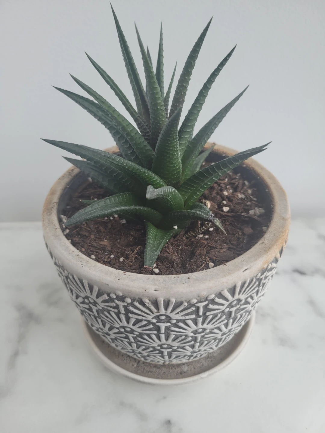 This Haworthia plant comes in a stylish decorative pot with a matching saucer. It's a low-maintenance succulent that thrives in bright, indirect light. A great addition to any indoor space!