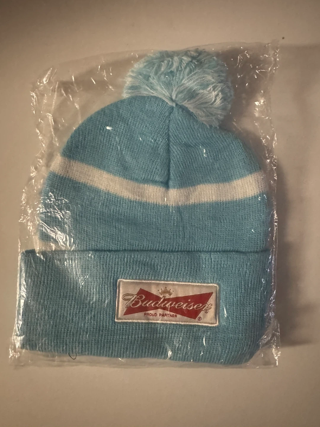 Light blue knit toque with white stripes and a pompom. Features a "Hockey Night in Canada" patch on one side and a Budweiser "Proud Partner" logo on the other. This toque is great for staying warm while cheering on your favourite hockey team!