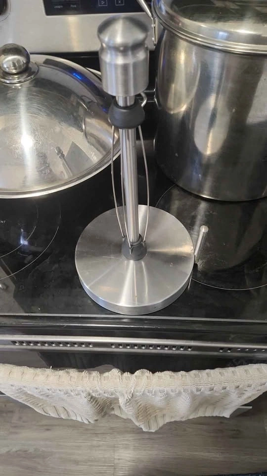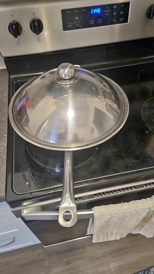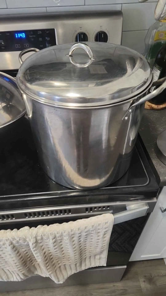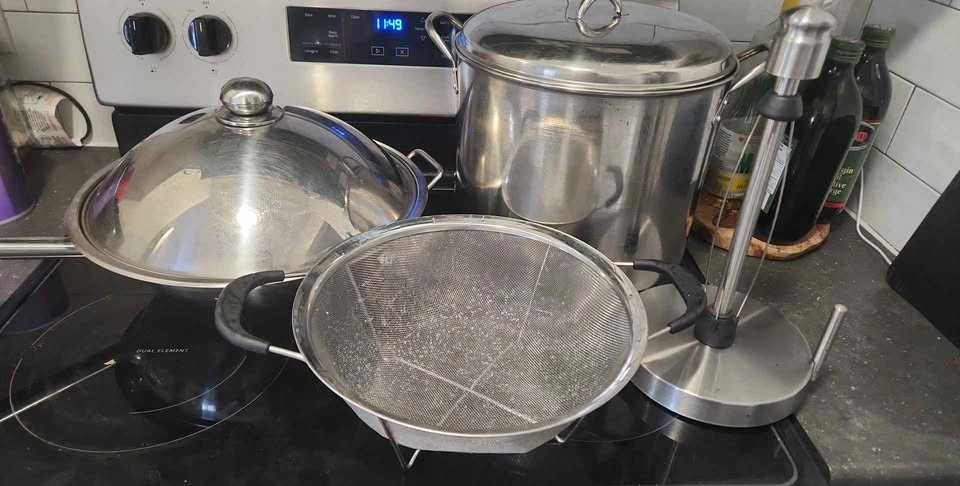 Versatile kitchen set! Includes a stainless steel wok pan with lid, great for stir-fries. Also a super large stainless steel stock pot with lid, perfect for big batches of soup or pasta. Plus, a handy paper towel holder that attaches to your stove handle. All stainless steel. Includes strainer.