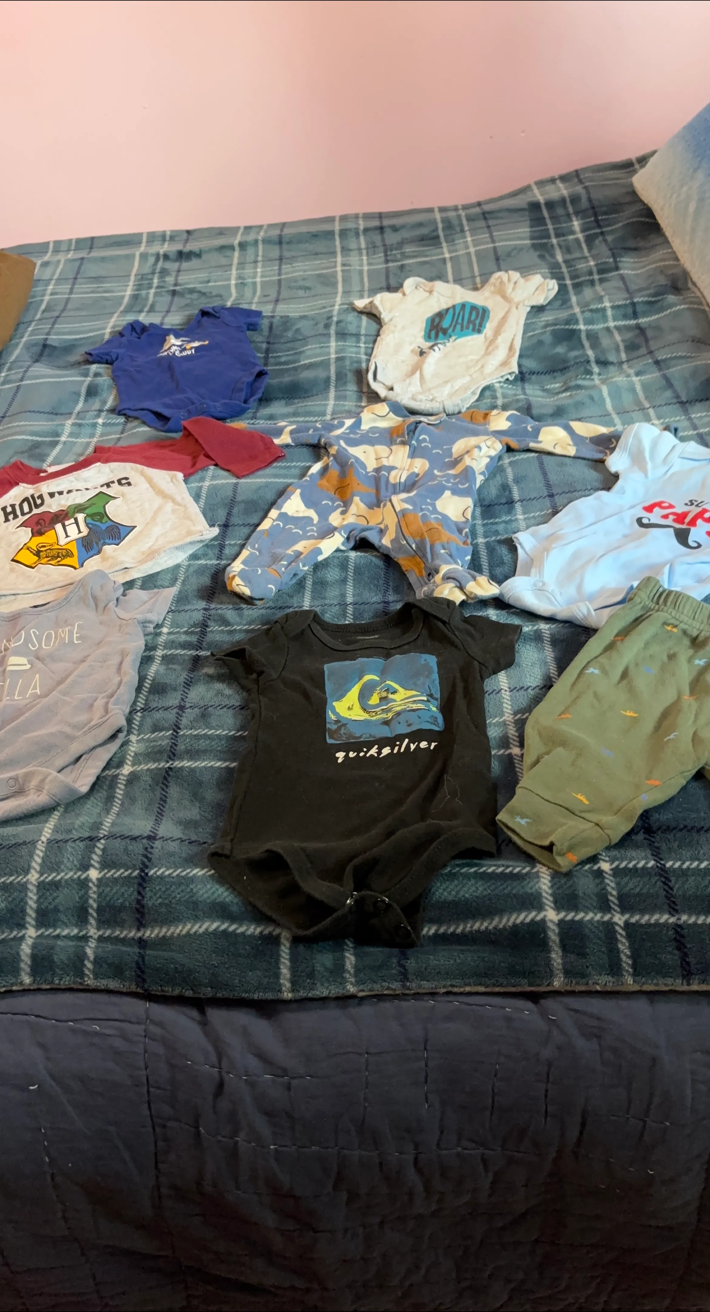 Selling a mixed bundle of baby clothes! There's a Quiksilver onesie, a Harry Potter t-shirt, and other cute items. Perfect for your little one!