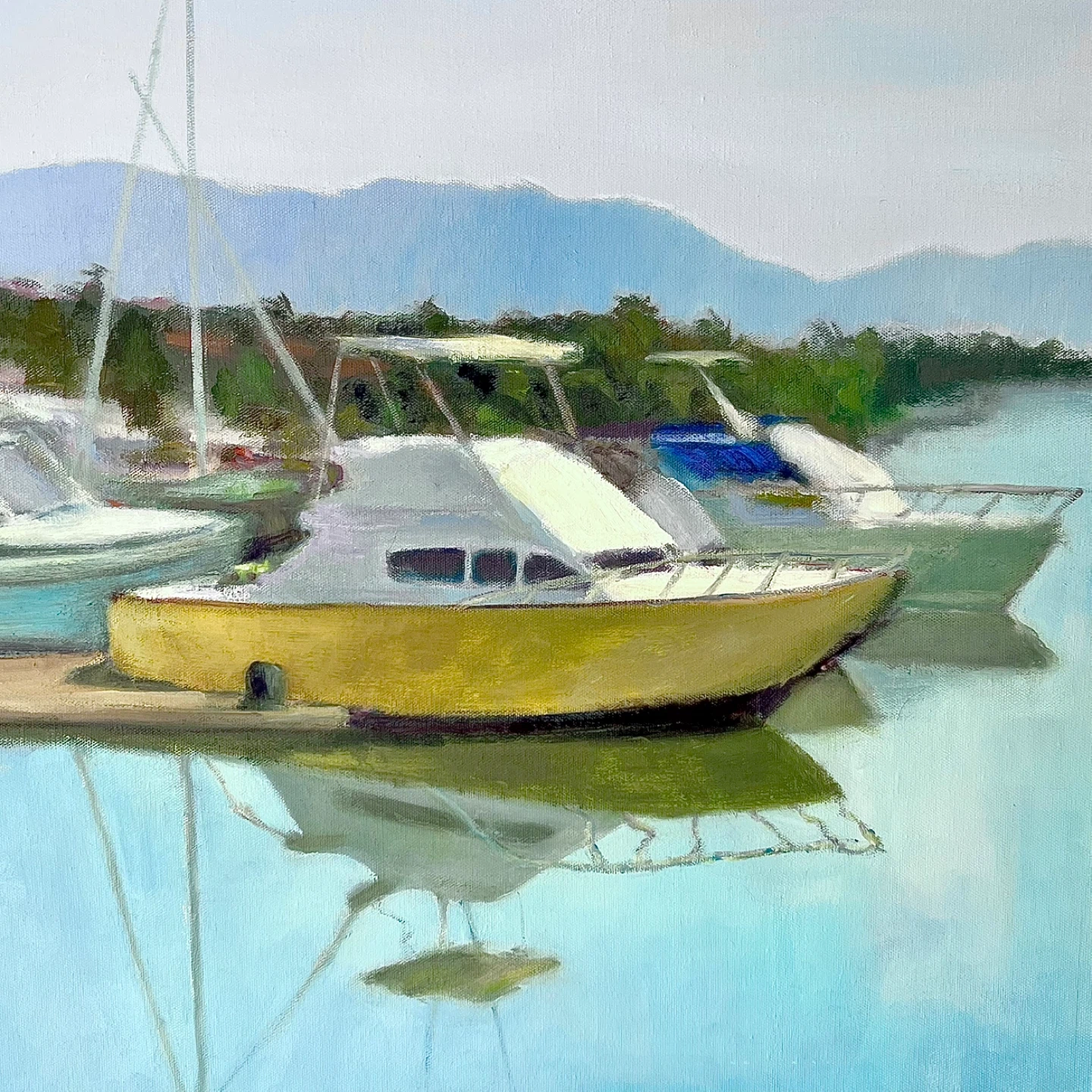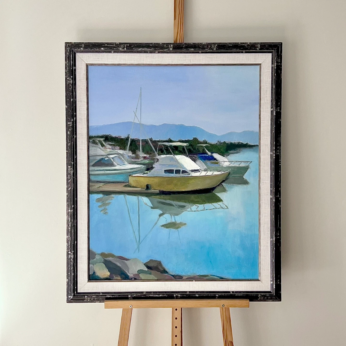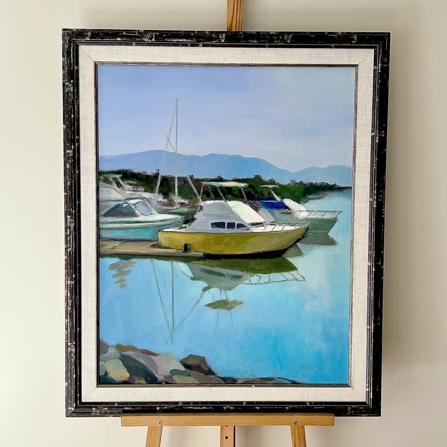 Striking large painting on canvas of boats docked at a marina, set in black frame with silver accenting. The painting itself is 24”w x30”h and the frame measures 30”w x36”h. No damage