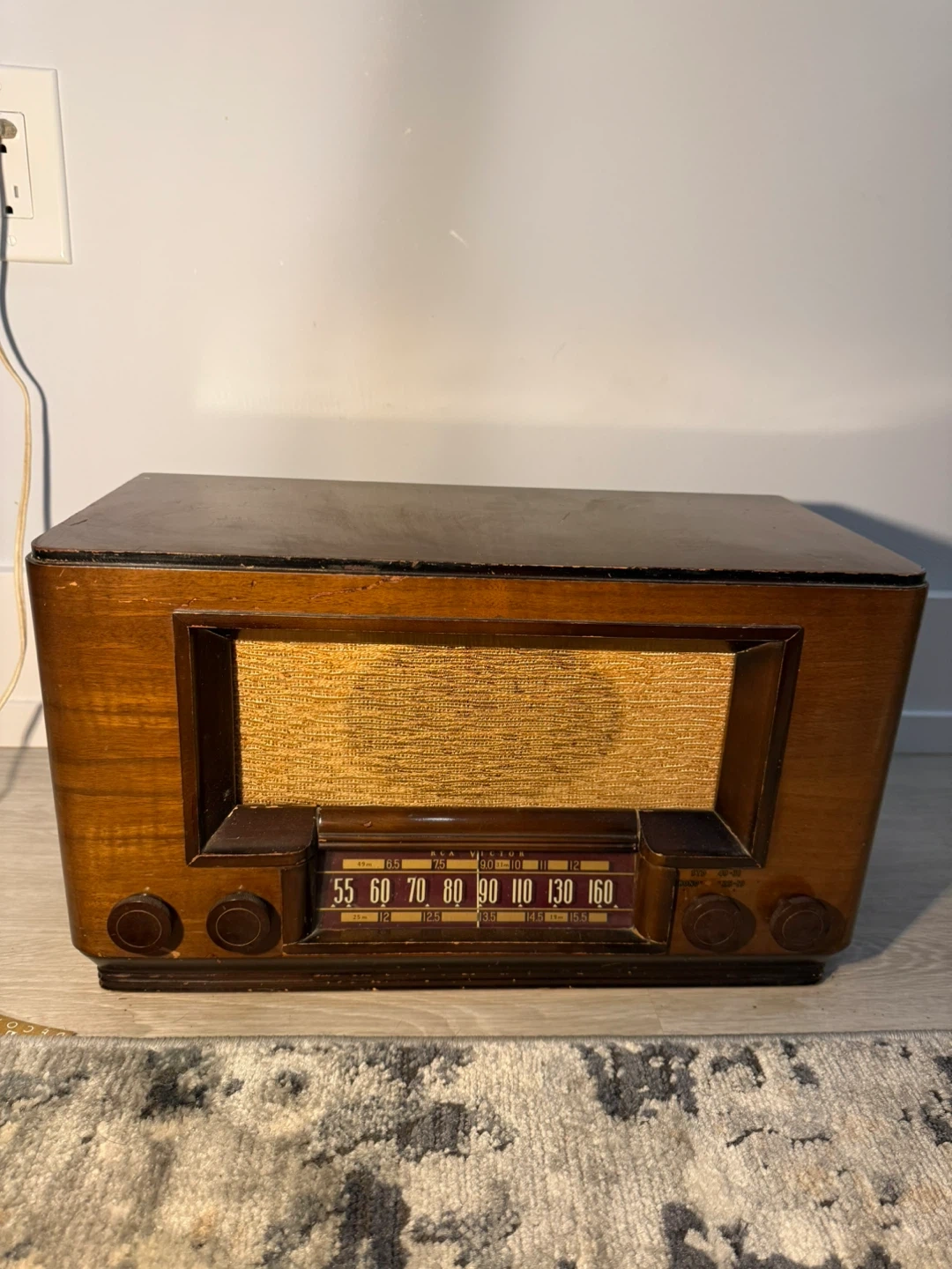 This is a working vintage tube radio housed in a beautiful wooden cabinet. It features a fabric speaker cover and a classic dial. This would be a neat piece for collectors or for someone looking to add a retro touch to their home. It's a great conversation starter!