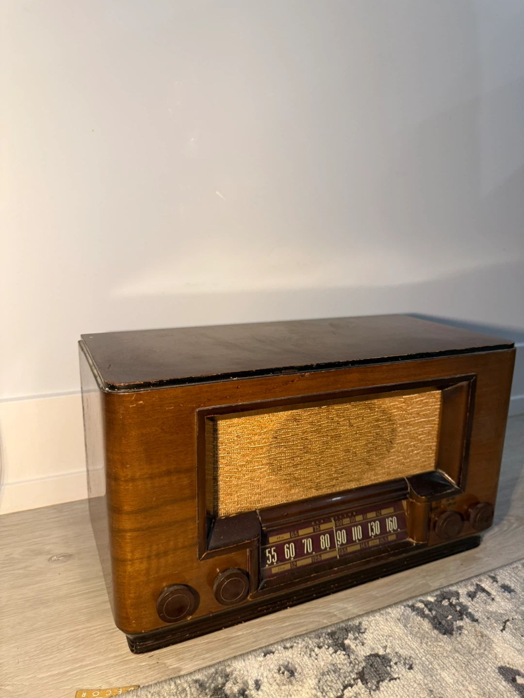 This is a working vintage tube radio housed in a beautiful wooden cabinet. It features a fabric speaker cover and a classic dial. This would be a neat piece for collectors or for someone looking to add a retro touch to their home. It's a great conversation starter!