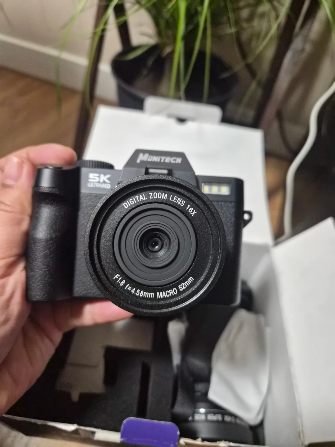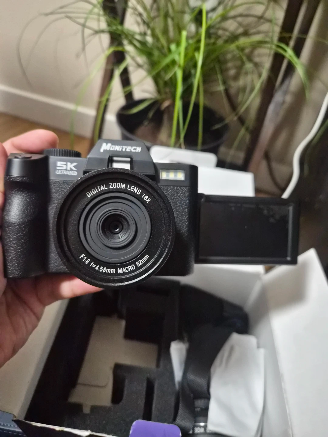 Monitech S110 digital camera with 5K Ultra HD resolution. It features a 16x digital zoom lens with a 52mm filter thread and f/1.8 aperture. The camera includes a flip-up screen and comes with its original box and instruction manual. It's great for capturing clear photos and videos!