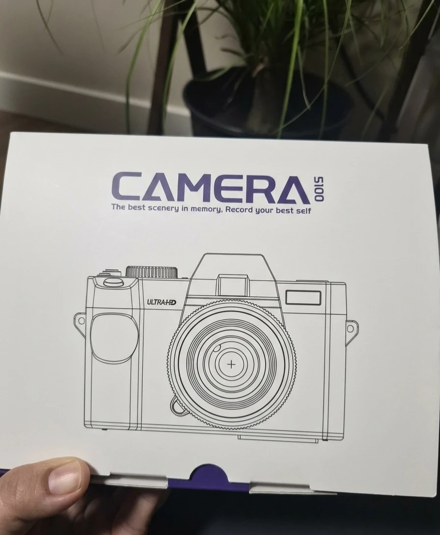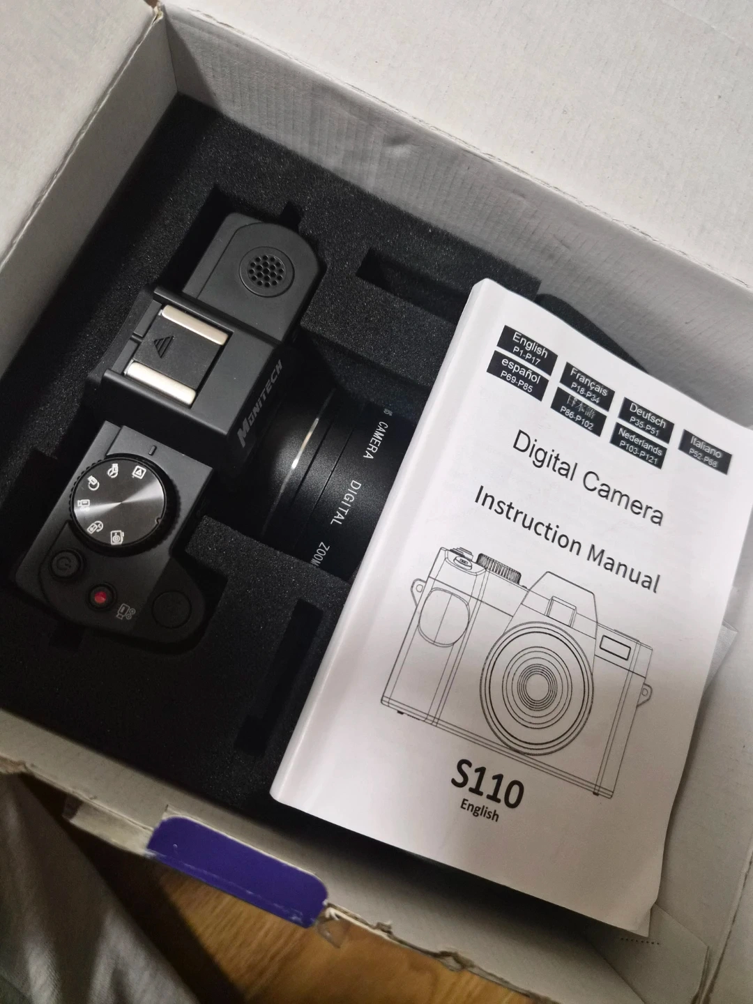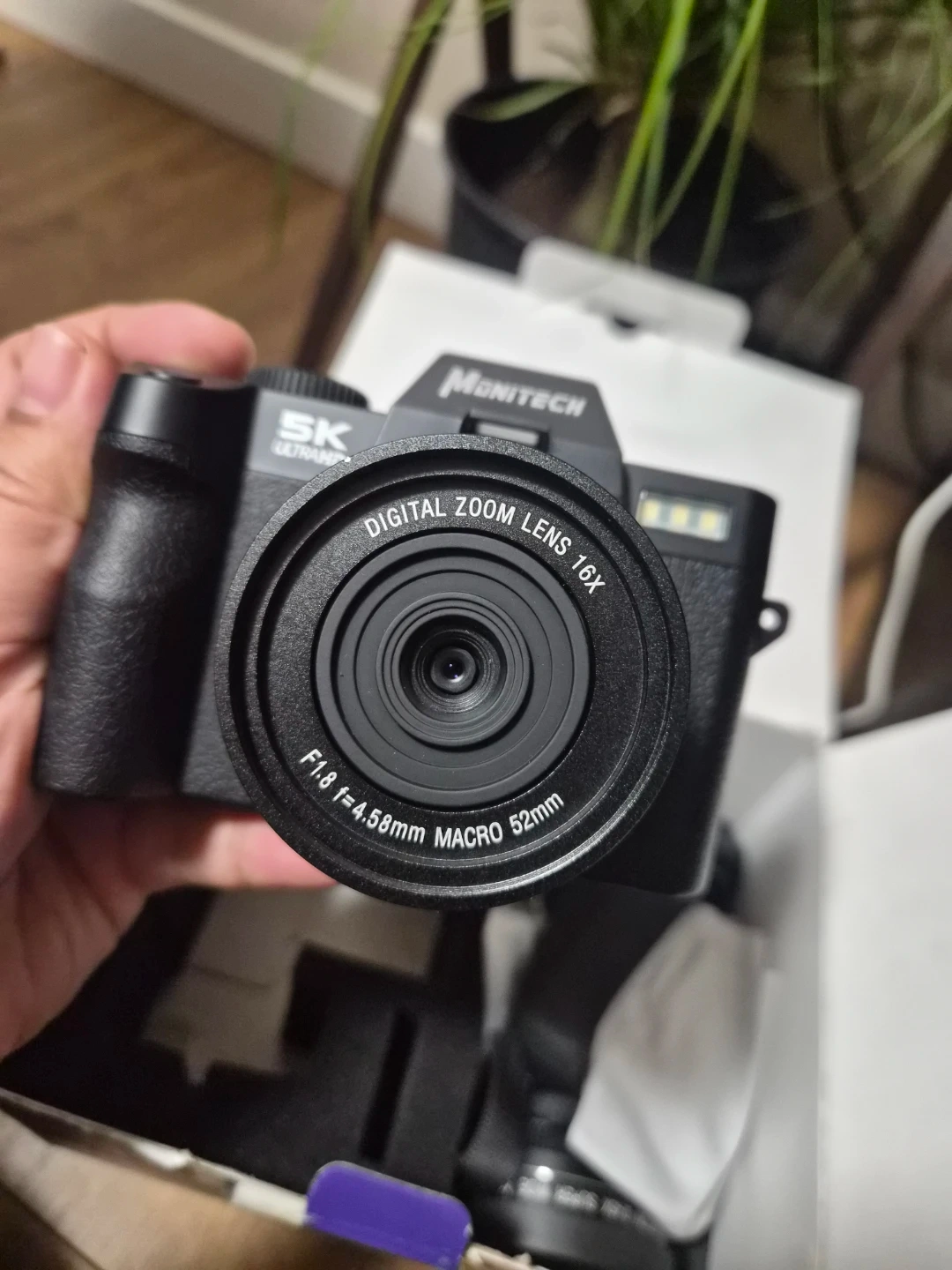Monitech S110 digital camera with 5K Ultra HD resolution. It features a 16x digital zoom lens with a 52mm filter thread and f/1.8 aperture. The camera includes a flip-up screen and comes with its original box and instruction manual. It's great for capturing clear photos and videos!
