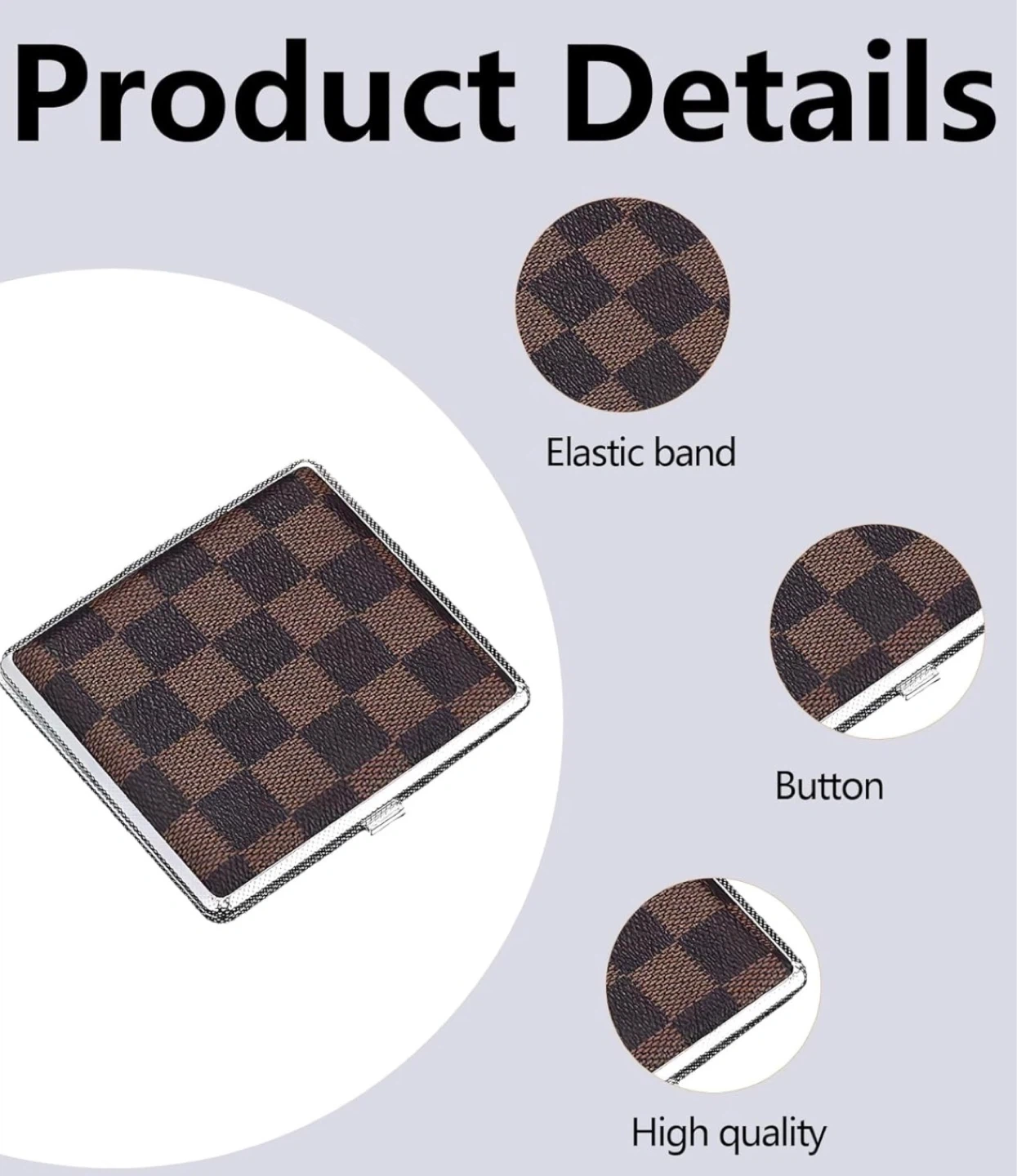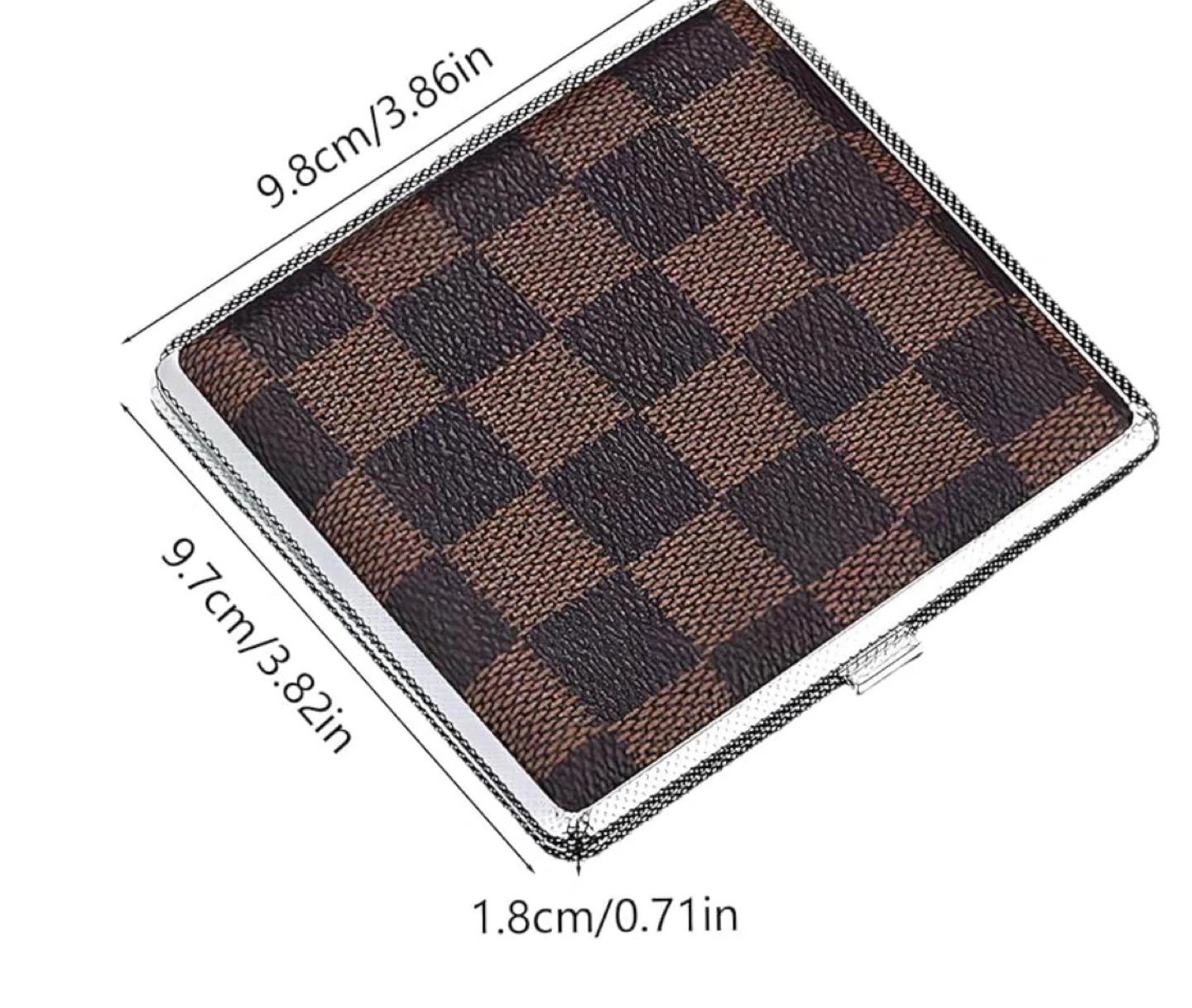 This cigarette case has a checkerboard pattern design. It measures 9.7cm by 9.8cm and is 1.8cm thick.