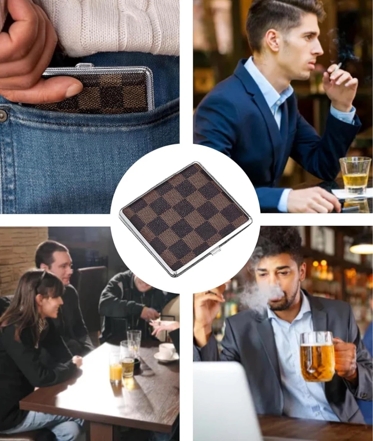 This cigarette case has a checkerboard pattern design. It measures 9.7cm by 9.8cm and is 1.8cm thick.