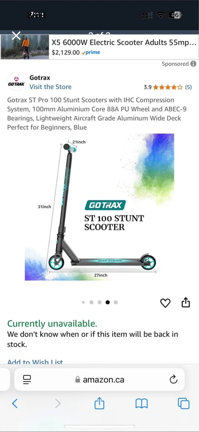 Selling a Gotrax ST Pro 100 stunt scooter! It has an IHC compression system and 100mm aluminum wheels with ABEC-9 bearings. The deck is lightweight aircraft-grade aluminum. Perfect for beginners and comes with the box!