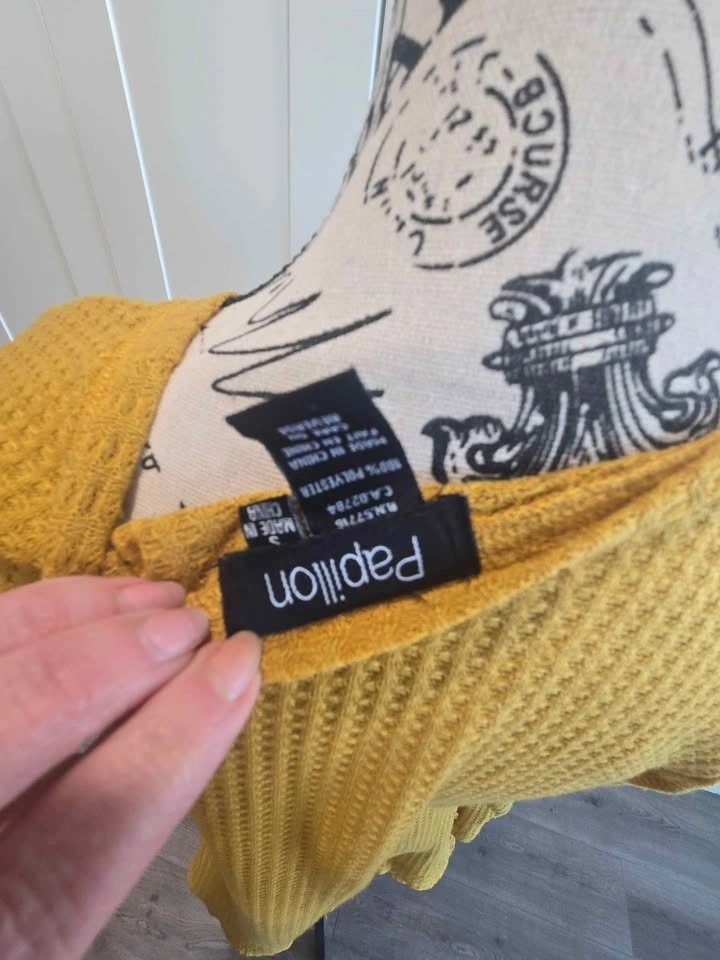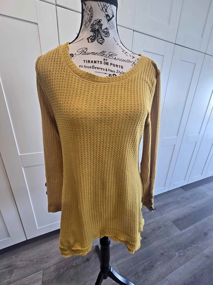 Waffle-style Papillon long sleeve top. Size small, but Papillon often runs big, so it will fit a medium for sure. Mustard yellow color. Features nice buttons on the bottom and sleeves. It's a longer style, great with skinny jeans or tights. Located in Huntington Hills NW.