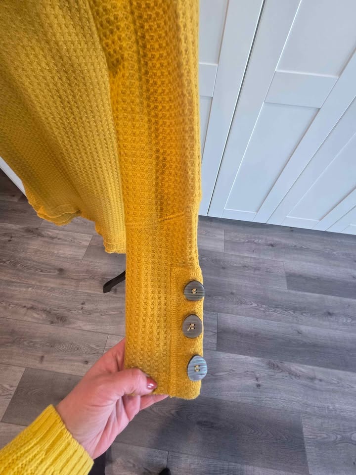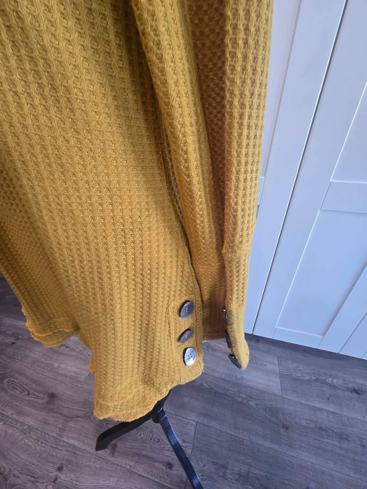 Waffle-style Papillon long sleeve top. Size small, but Papillon often runs big, so it will fit a medium for sure. Mustard yellow color. Features nice buttons on the bottom and sleeves. It's a longer style, great with skinny jeans or tights. Located in Huntington Hills NW.