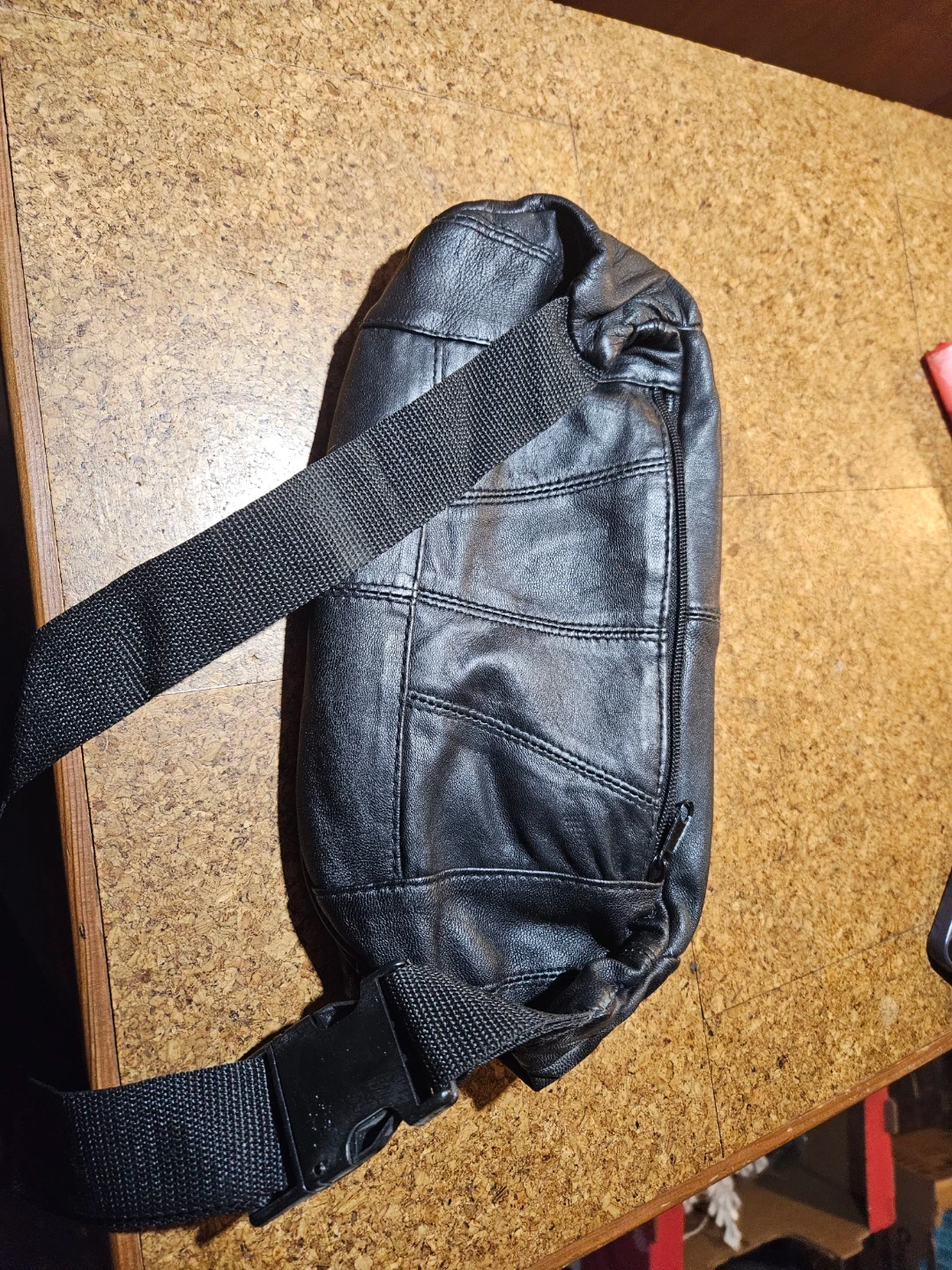 This black leather fanny pack has multiple zippered pockets and a main compartment. It features an adjustable strap and a buckle closure. The bag measures approximately 14 inches across.