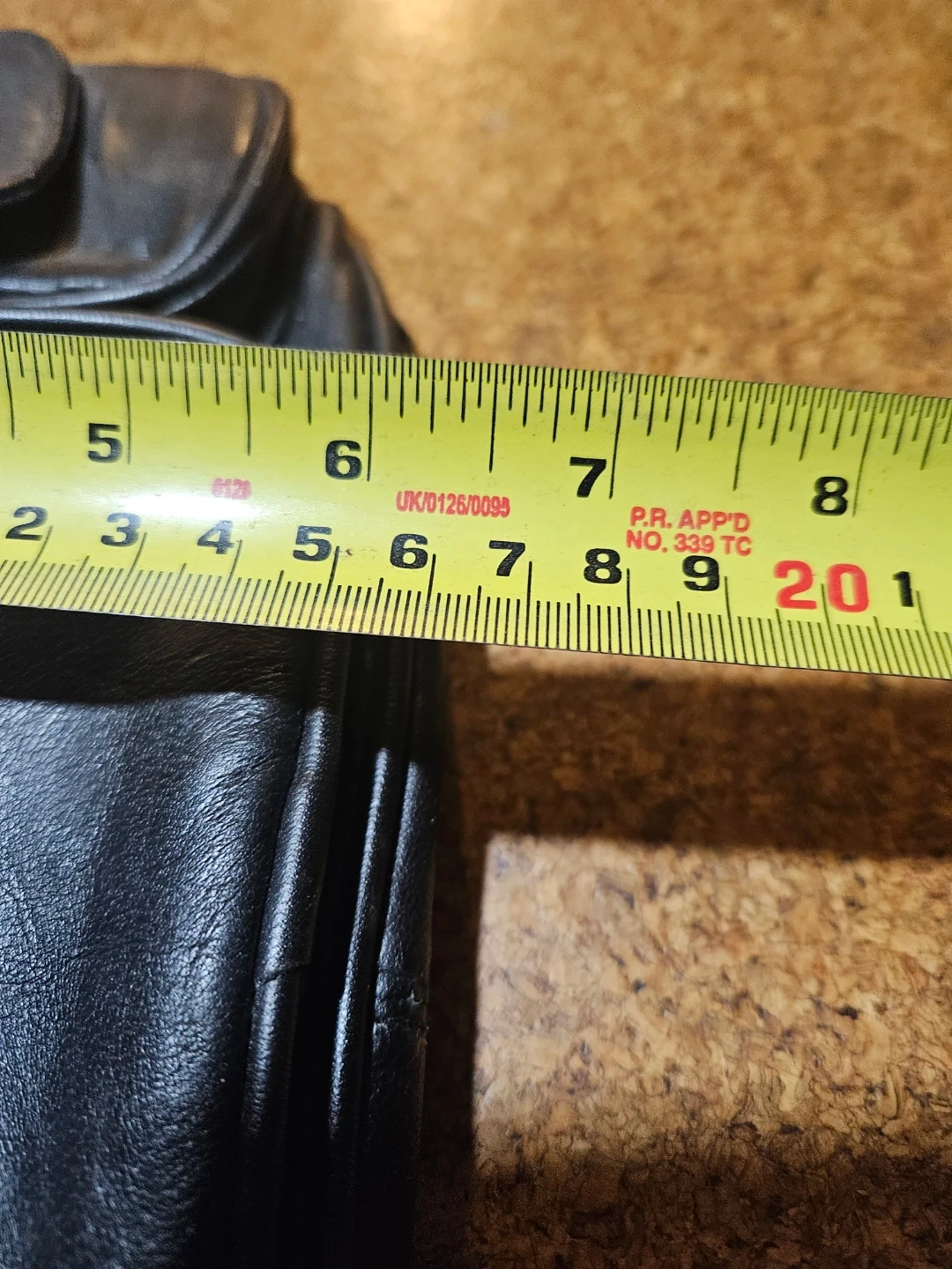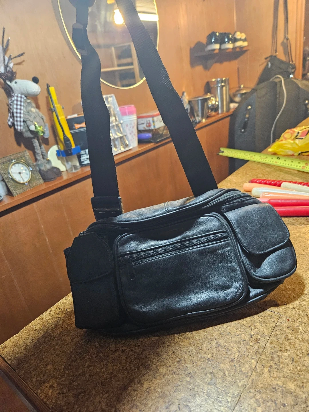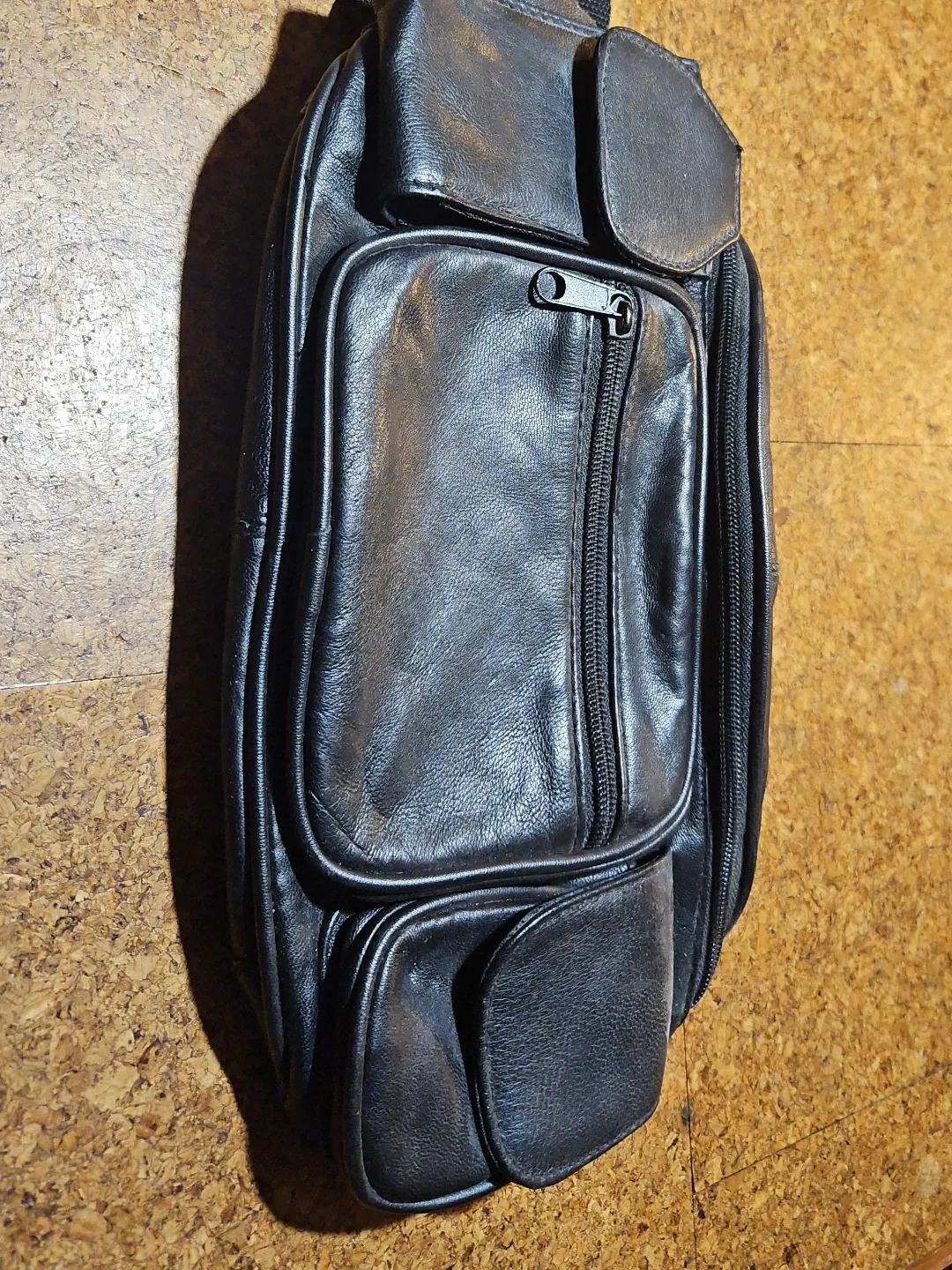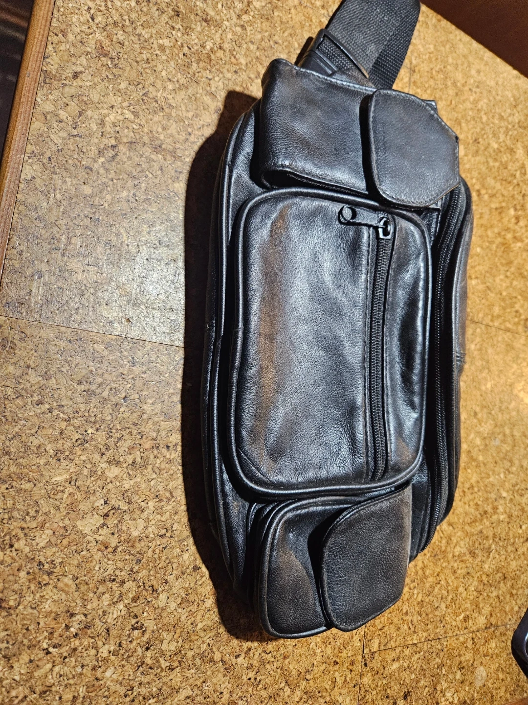 This black leather fanny pack has multiple zippered pockets and a main compartment. It features an adjustable strap and a buckle closure. The bag measures approximately 14 inches across.