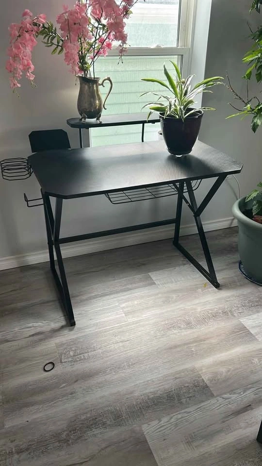 * Black & Carbon Fiber Gaming Desk (headset hanger, cup holder, shelves)
