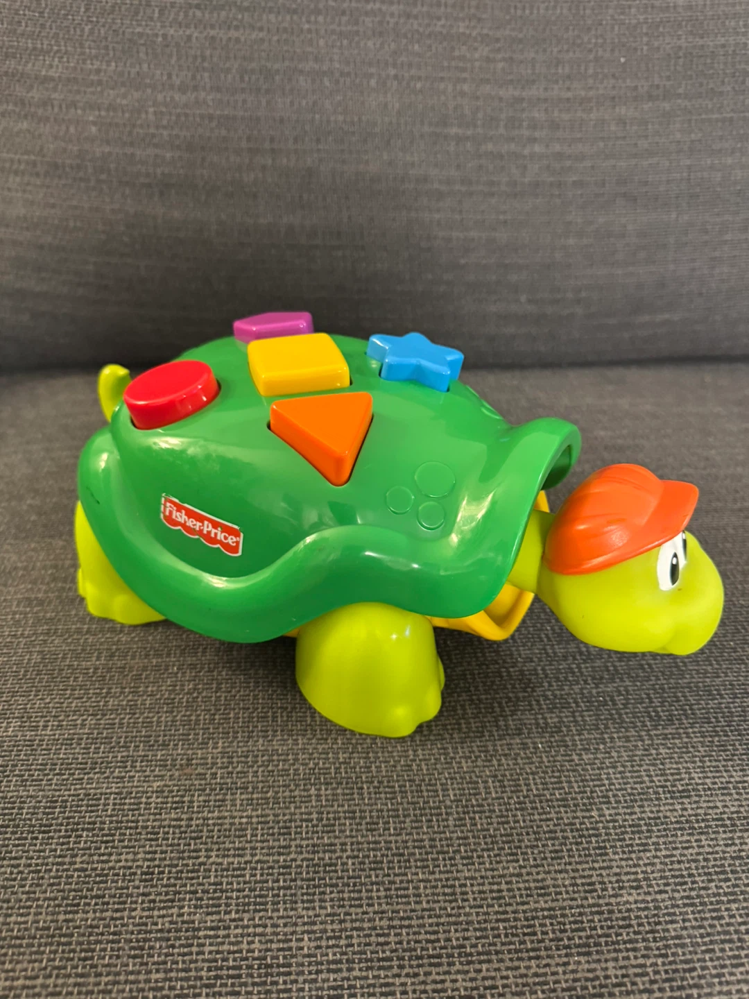 This is a cute Fisher-Price turtle toy! It's a shape sorter with different coloured shapes to fit into the shell. Great for toddlers learning colours and shapes