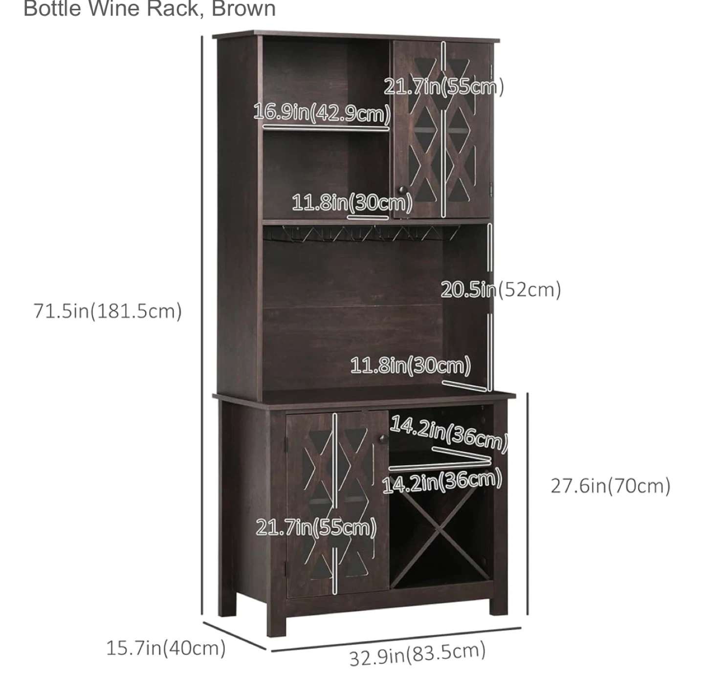 Selling a brown bottle wine rack with a cabinet. It has dimensions of about 71.5 inches (181.5cm) in height, 32.9 inches (83.5cm) in width, and 15.7 inches (40cm) in depth. The cabinet doors are approximately 21.7 inches (55cm) wide and 14.2 inches (36cm) high. Great for storing your wine bottles and glasses!