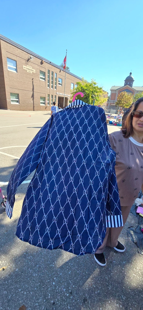 Here's a fun patterned long sleeve shirt! It has a unique design with a mix of colours and patterns. The shirt looks to be in good condition and would be a stylish addition to any wardrobe
