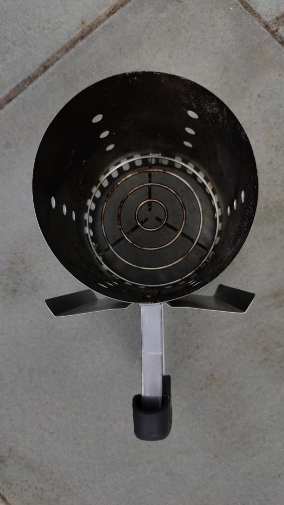 A charcoal chimney starter, perfect for getting your grill ready for your next cookout. It features a cylindrical container with air vents and a handle for easy use and transport. This tool is great for providing you with a stress-free grilling experience.