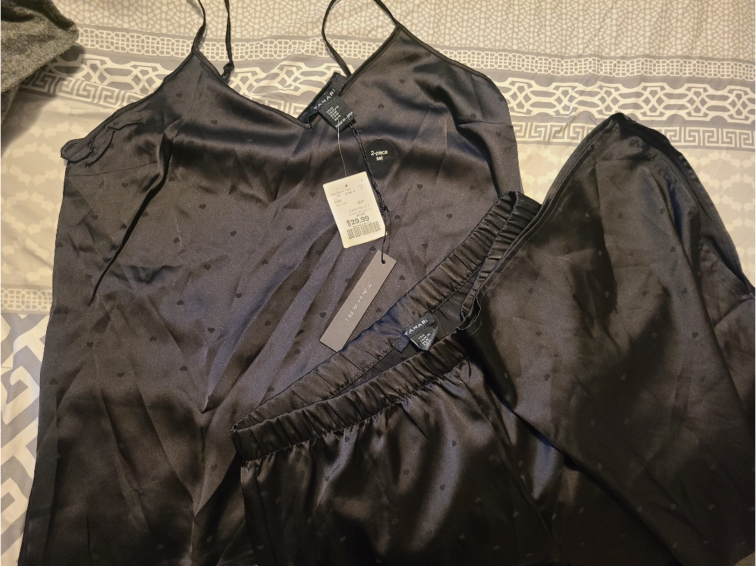 Black satin pajama set. Features a cami top and pant. Small hearts throughout. New with tags.