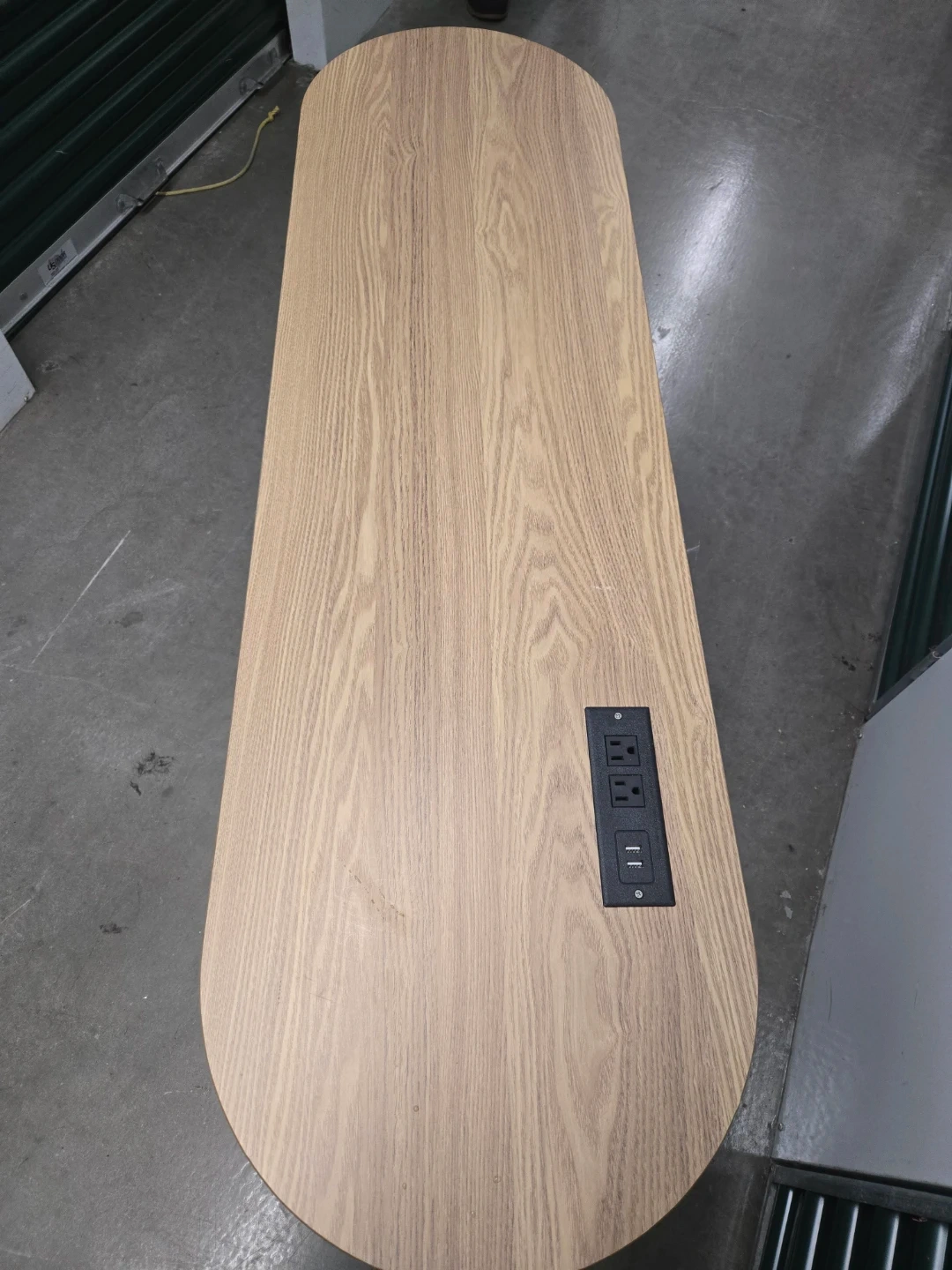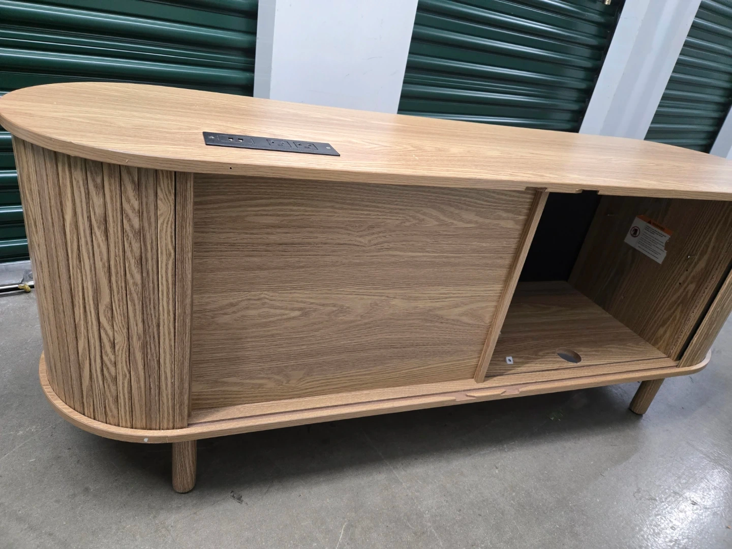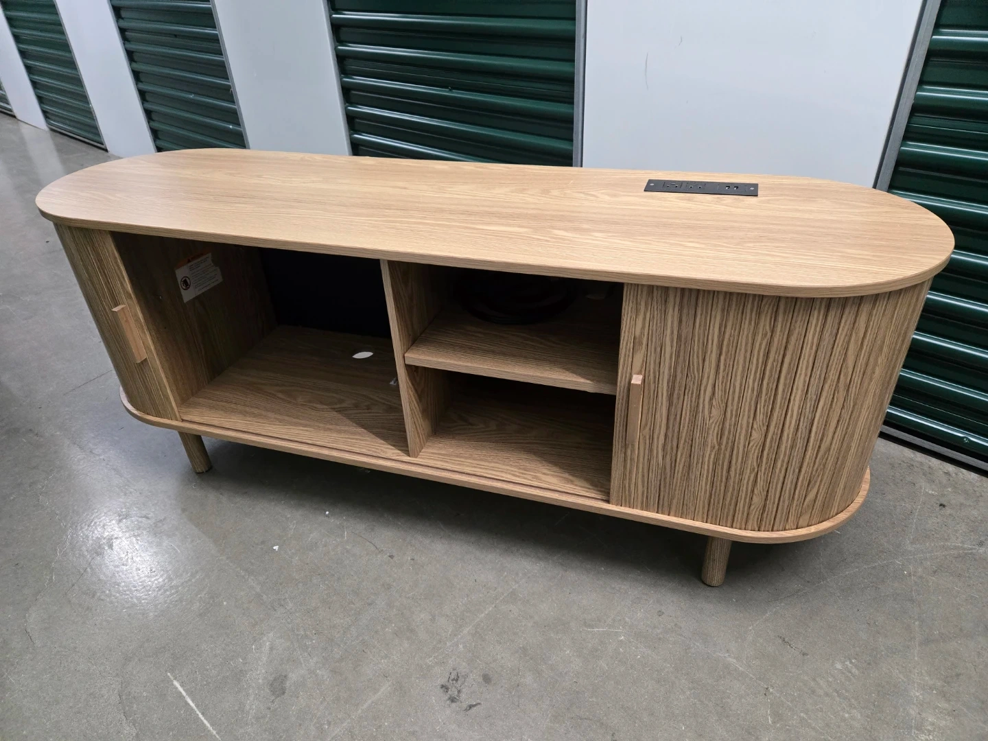 **Closing Sale** Selling a light wood media console in great condition! It features a unique design with sliding doors and a built-in power outlet on top. Perfect for organizing your entertainment setup and adding a touch of style to your living room