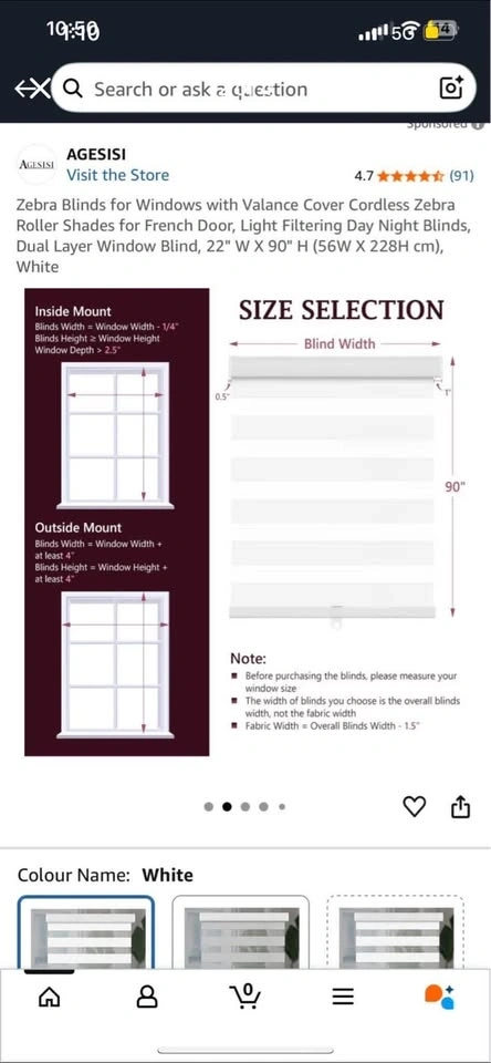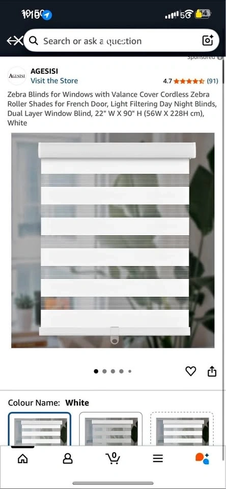 White, sheer opacity zebra roller shades from AGESISI. Made of 100% polyester, these dual-layered blinds feature alternating sheer and solid stripes to control light and provide privacy. The sturdy aluminum valance and weighted bottom rod ensure a neat appearance and balanced fabric. Height is adjustable from 0-90 inches, making them suitable for various windows and doors like French doors, patio doors, kitchens, bedrooms, and offices. The cordless design allows for easy operation and secure positioning. Size: 22" W x 90" H. Fabric is 1.5" narrower than the total width. For inside mount, window depth needs to be at least 2.5", and width should be 1/4" narrower than the window. For outside mount, blinds should be 4" wider and higher than the window. Brackets and instructions included for easy installation. Feel free to message if you have any questions! π₯