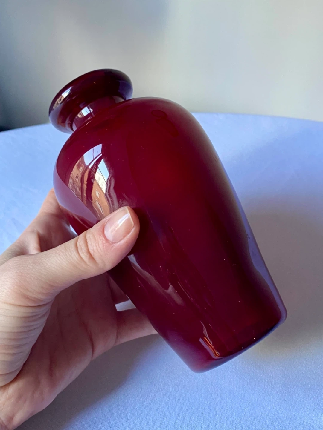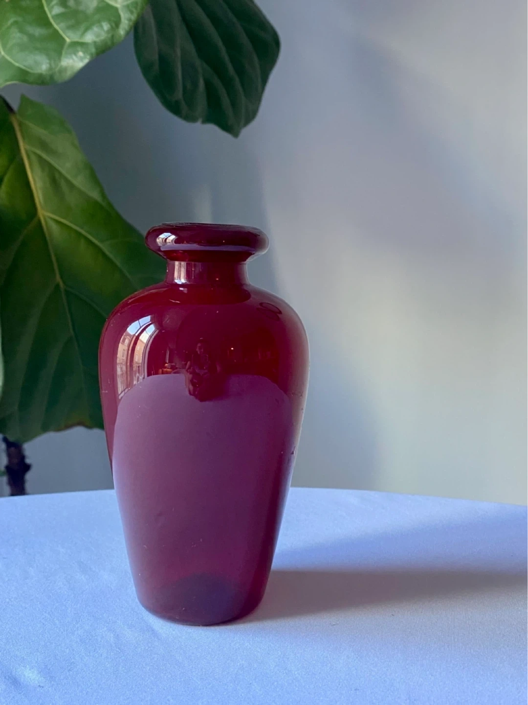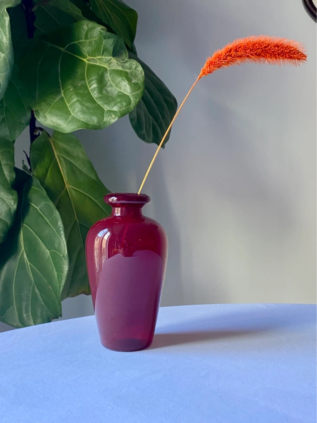 A lovely deep red glass vase. Smooth finish. Perfect for a small bouquet or dried flowers. Has a slight see through glass design that catches the light beautifully.