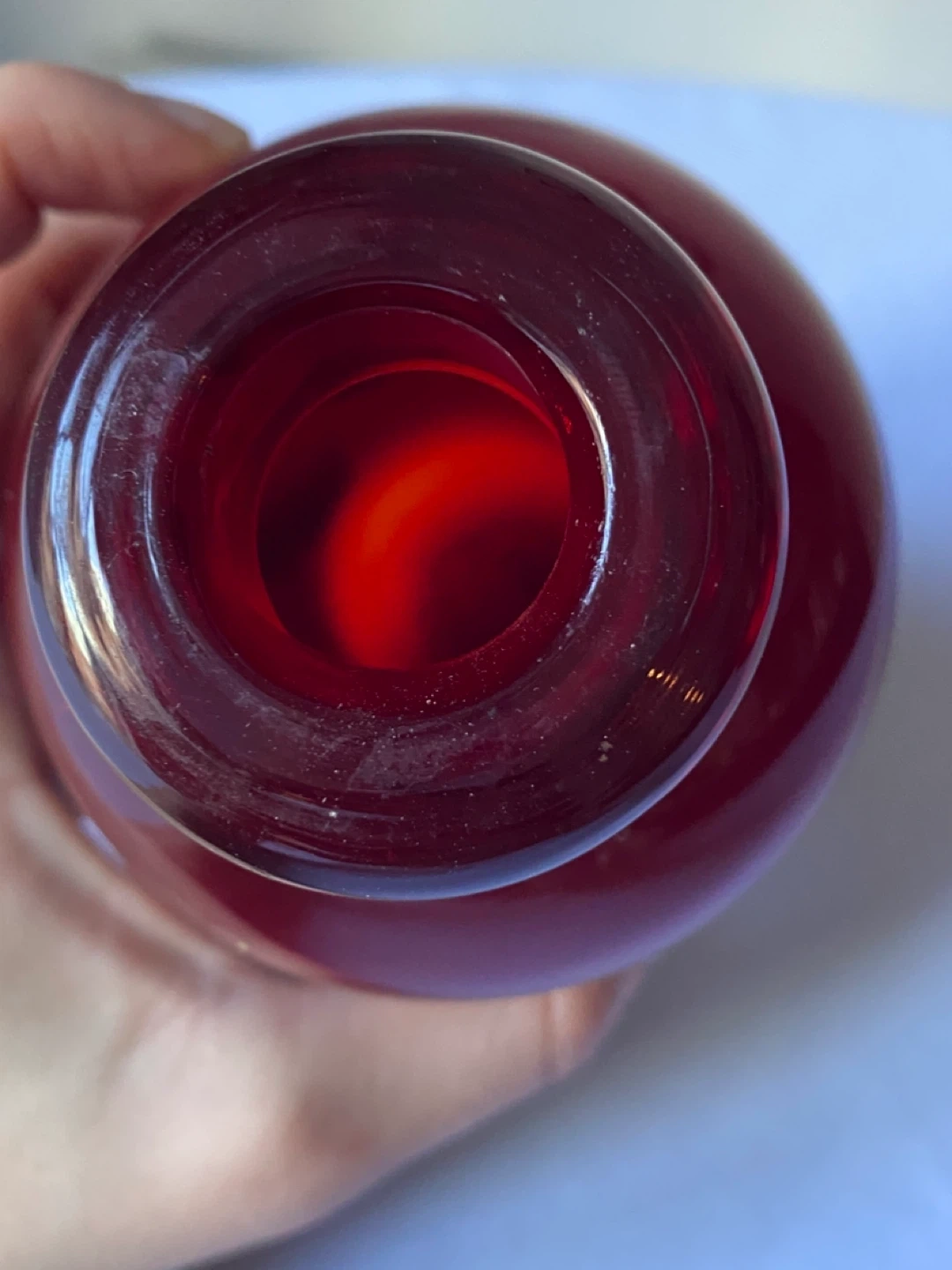 A lovely deep red glass vase. Smooth finish. Perfect for a small bouquet or dried flowers. Has a slight see through glass design that catches the light beautifully.