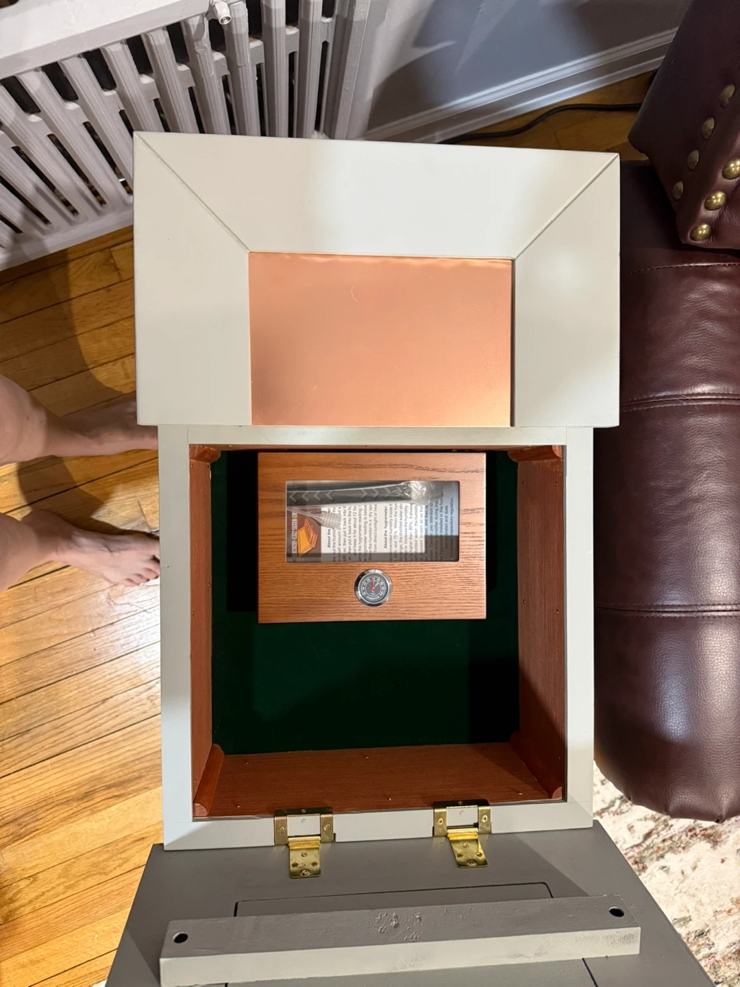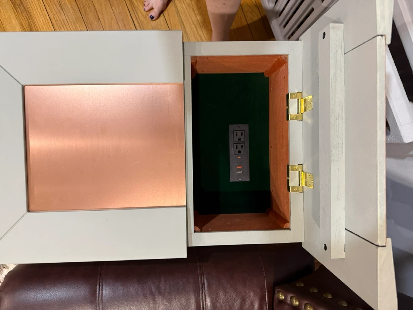 This grey side/end table features a copper inlay on the top. It has three drawers with copper knobs and a hidden compartment with built-in power outlets and USB ports. Great for keeping devices charged and organized!