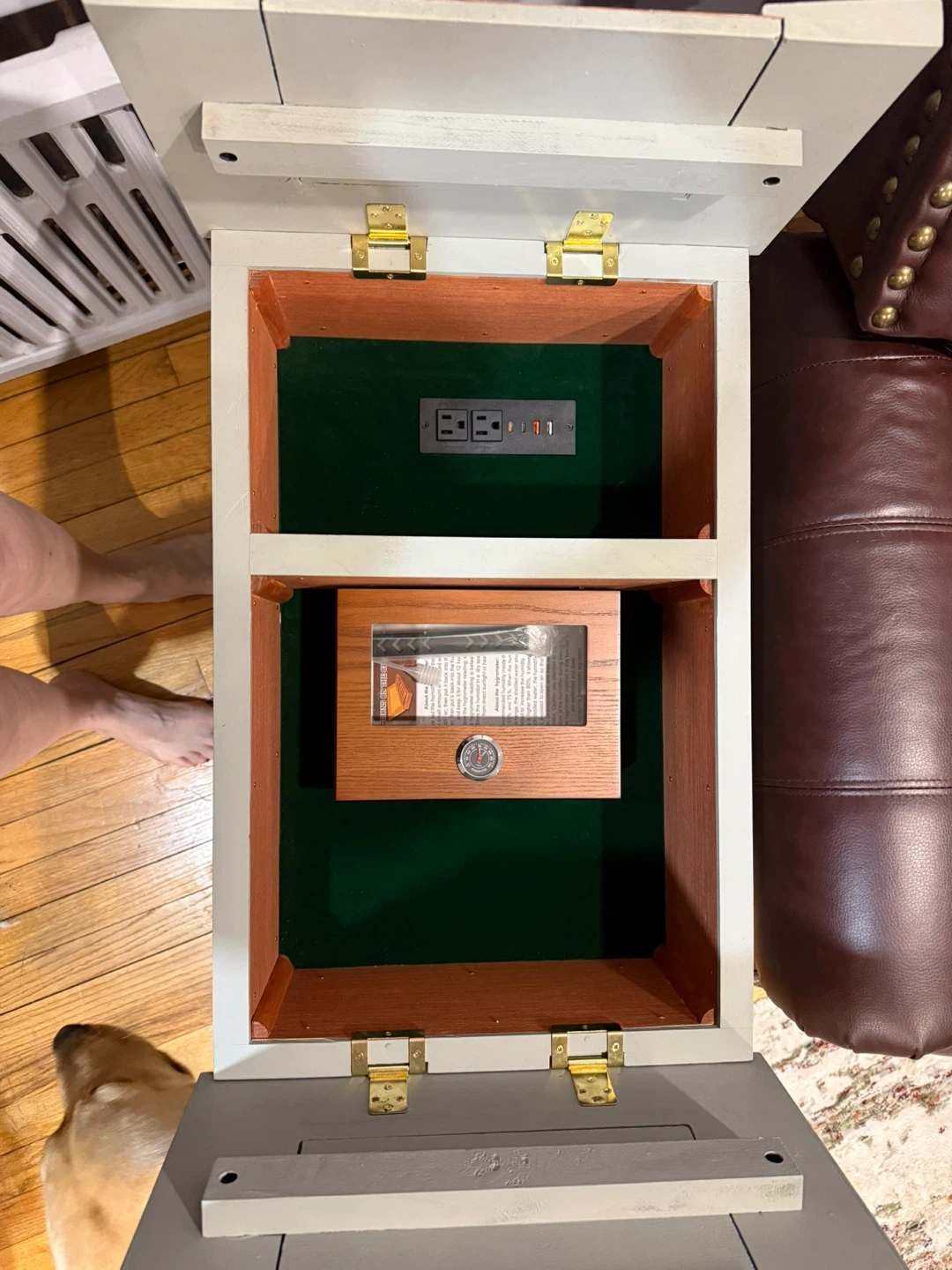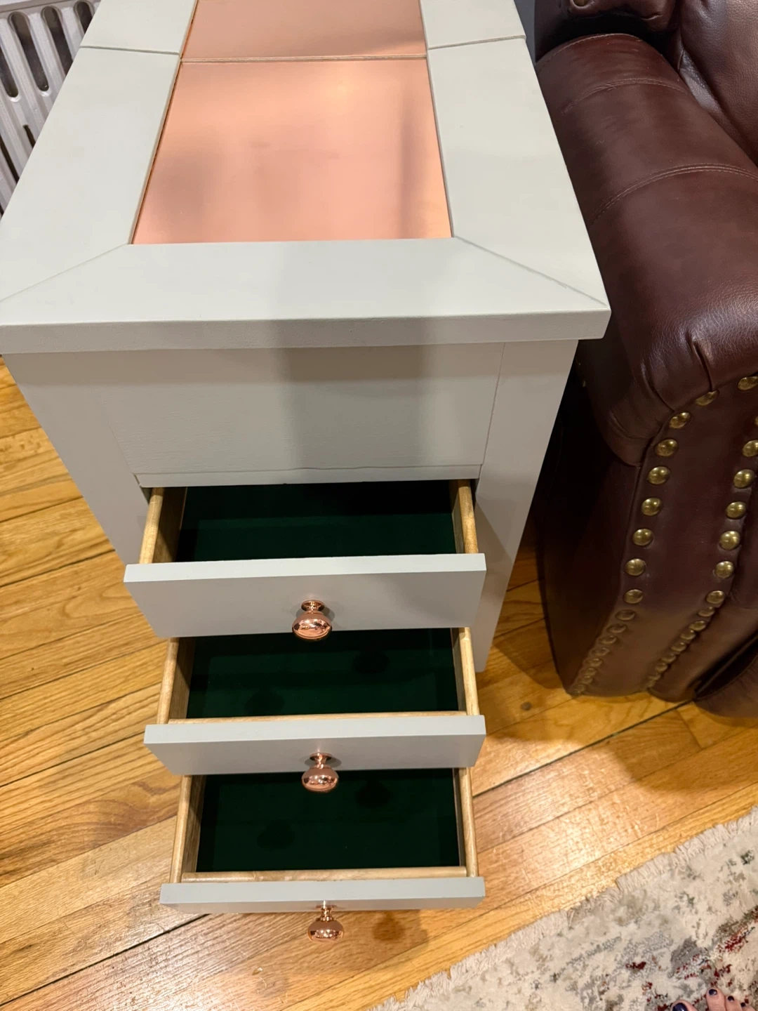 This grey side/end table features a copper inlay on the top. It has three drawers with copper knobs and a hidden compartment with built-in power outlets and USB ports. Great for keeping devices charged and organized!