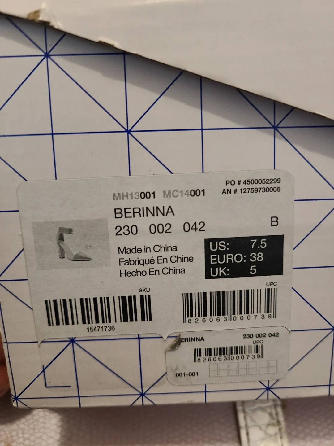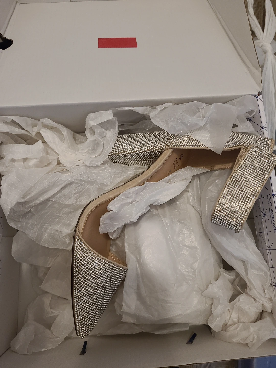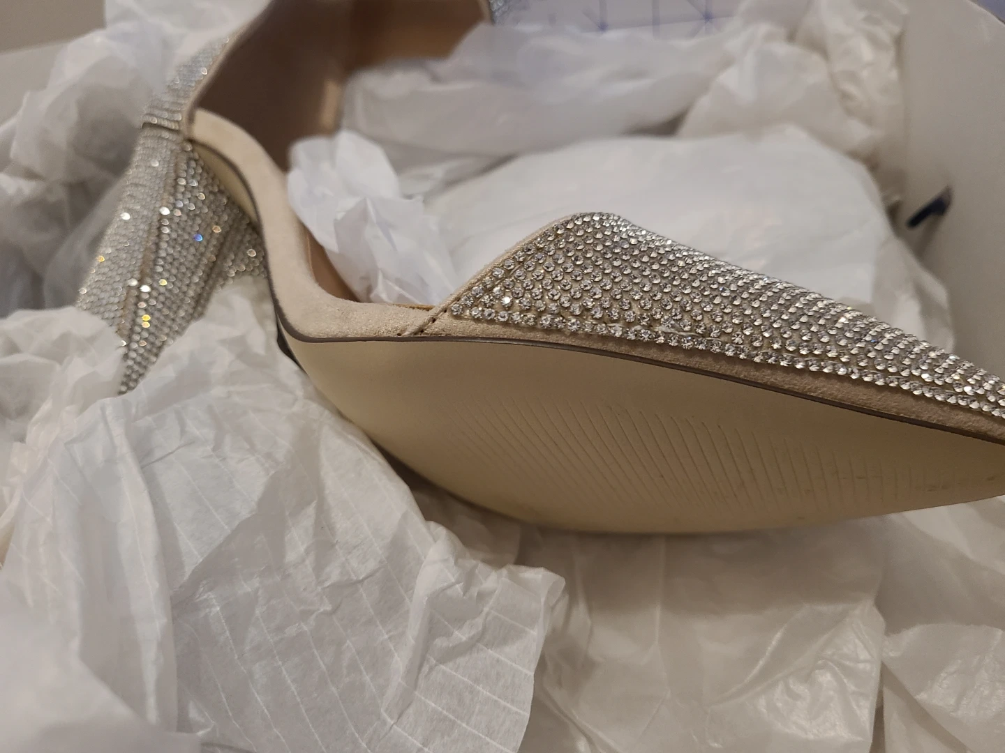 Stylish BERINNA heels covered in sparkling crystals. SIZE 7.5 WMNS. These shoes are sure to make a statement at any event!