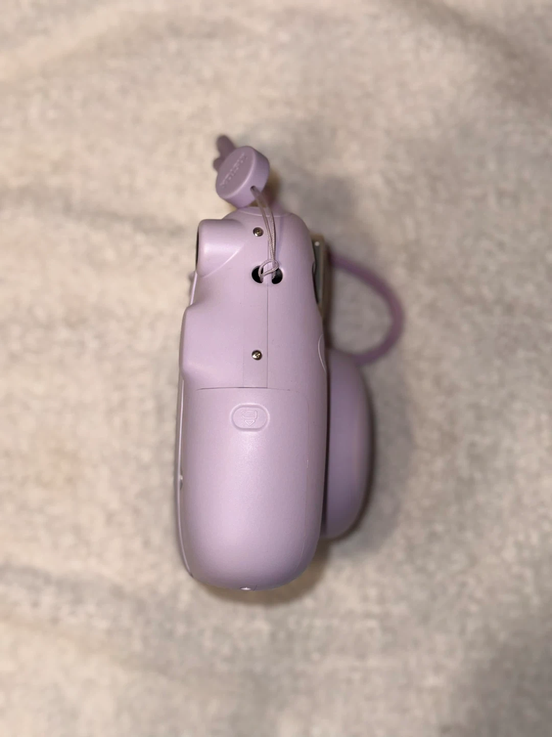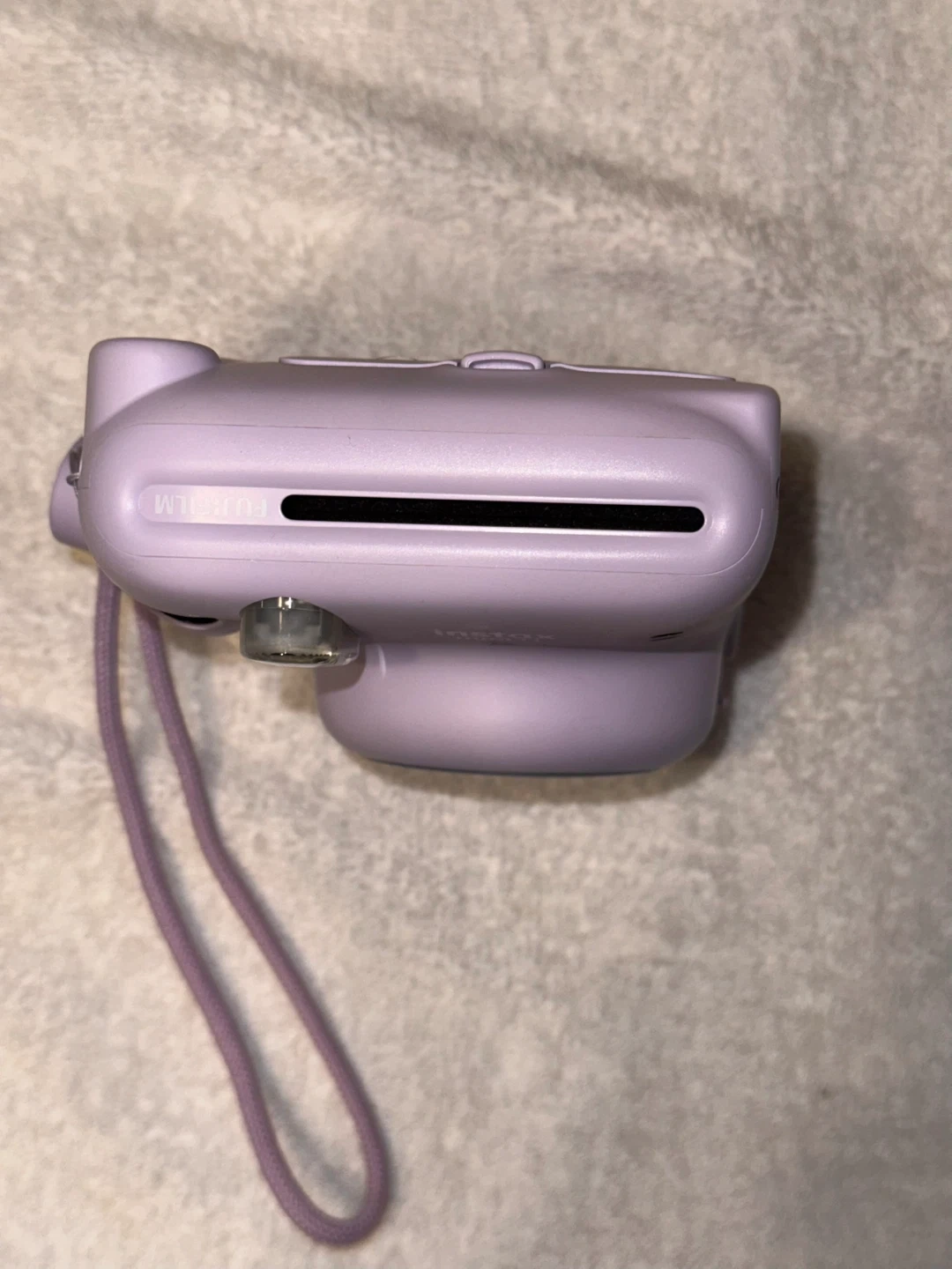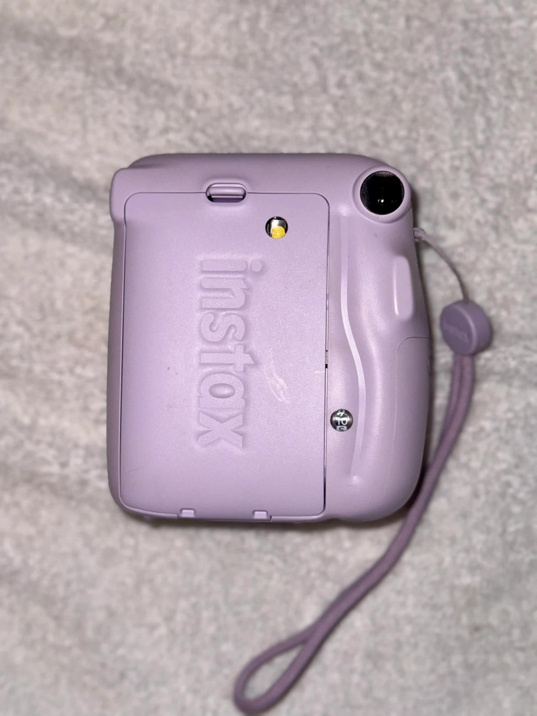 Fujifilm Instax Mini 11 instant camera in lilac purple. It's a compact and easy-to-use camera for instant prints. It features a built-in lens for close-ups and selfies. This camera is great for capturing memories on the go!