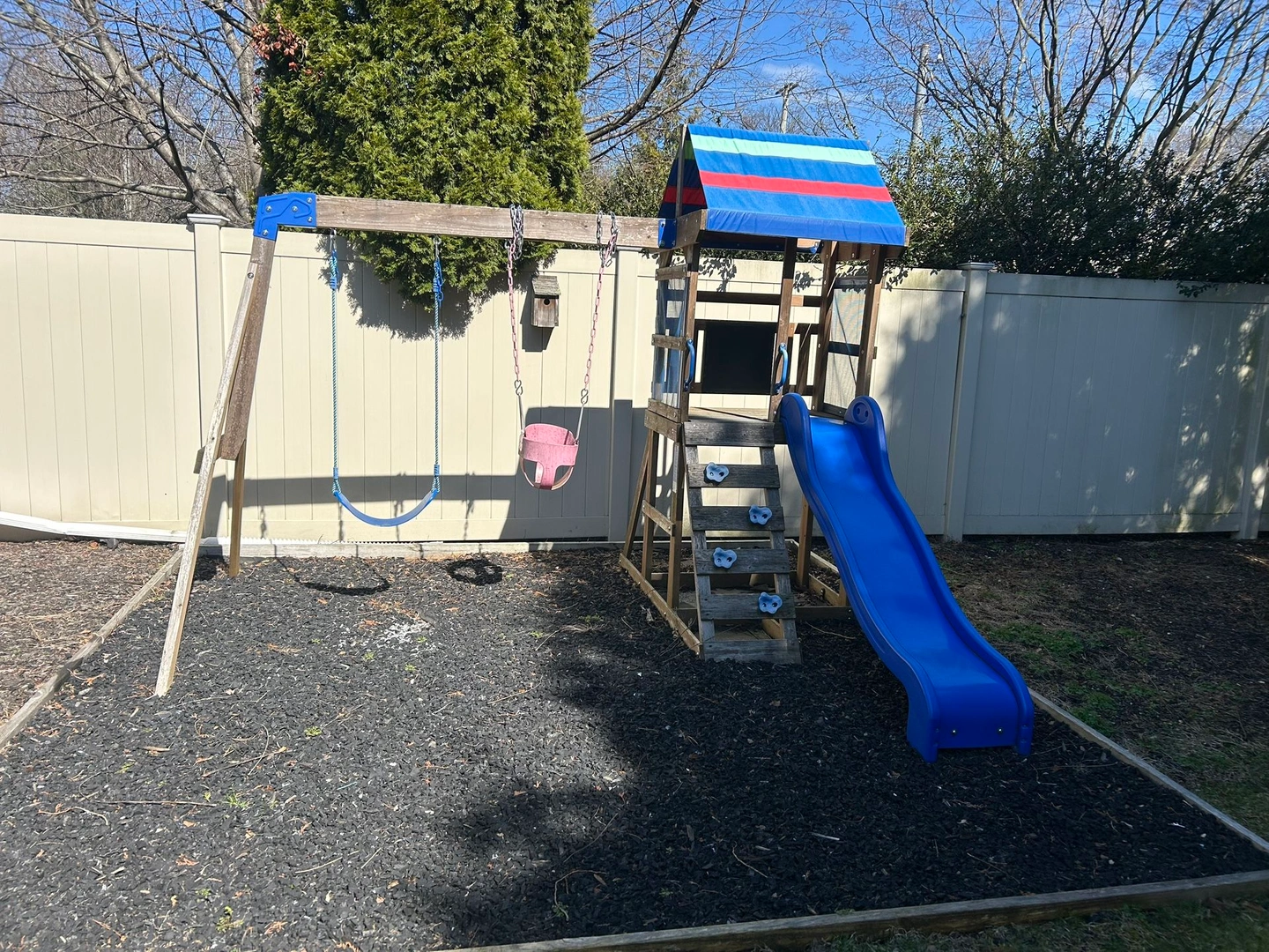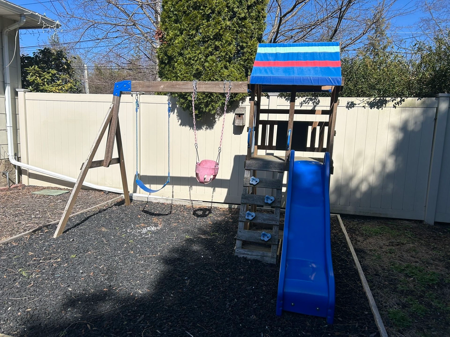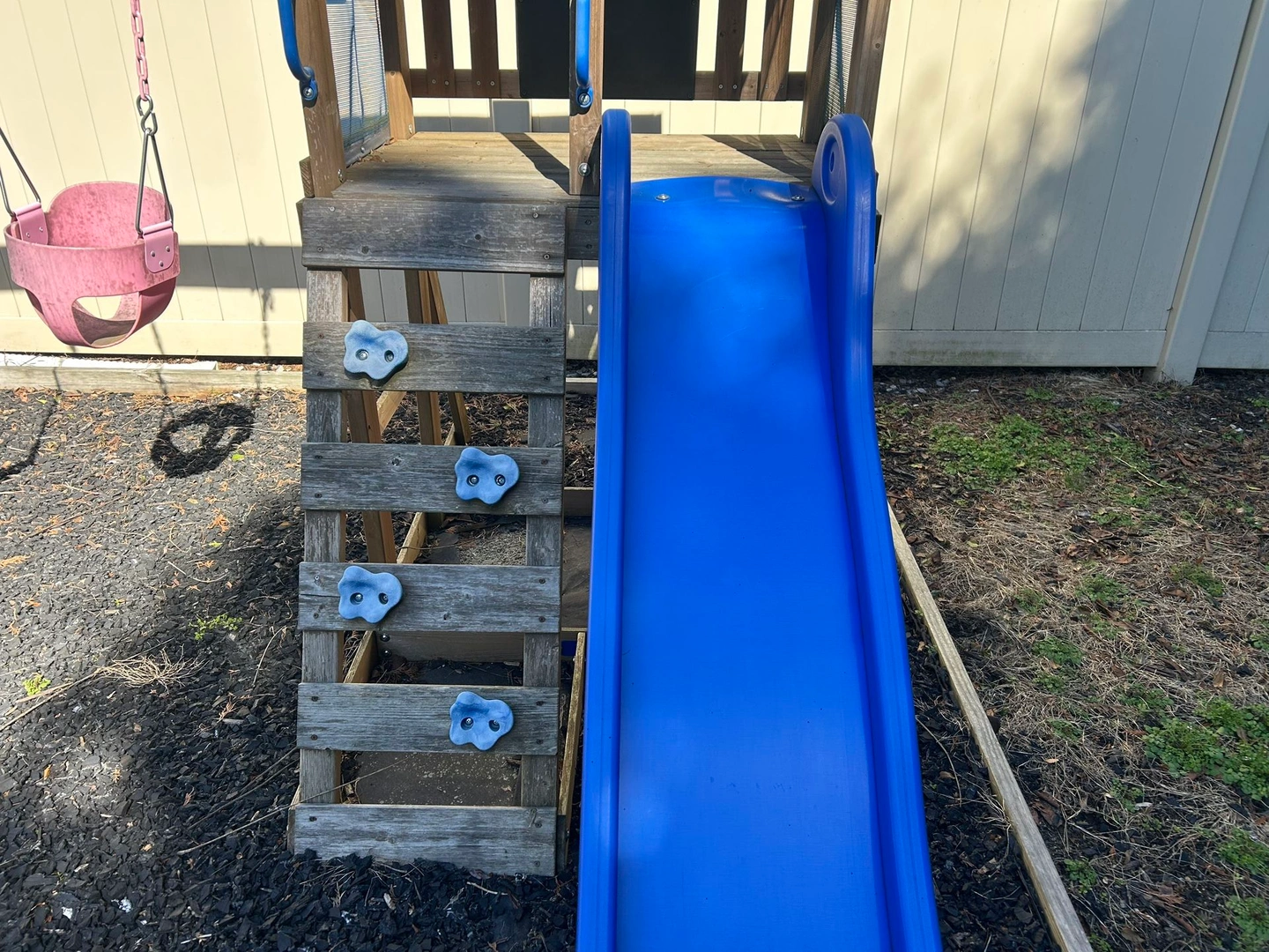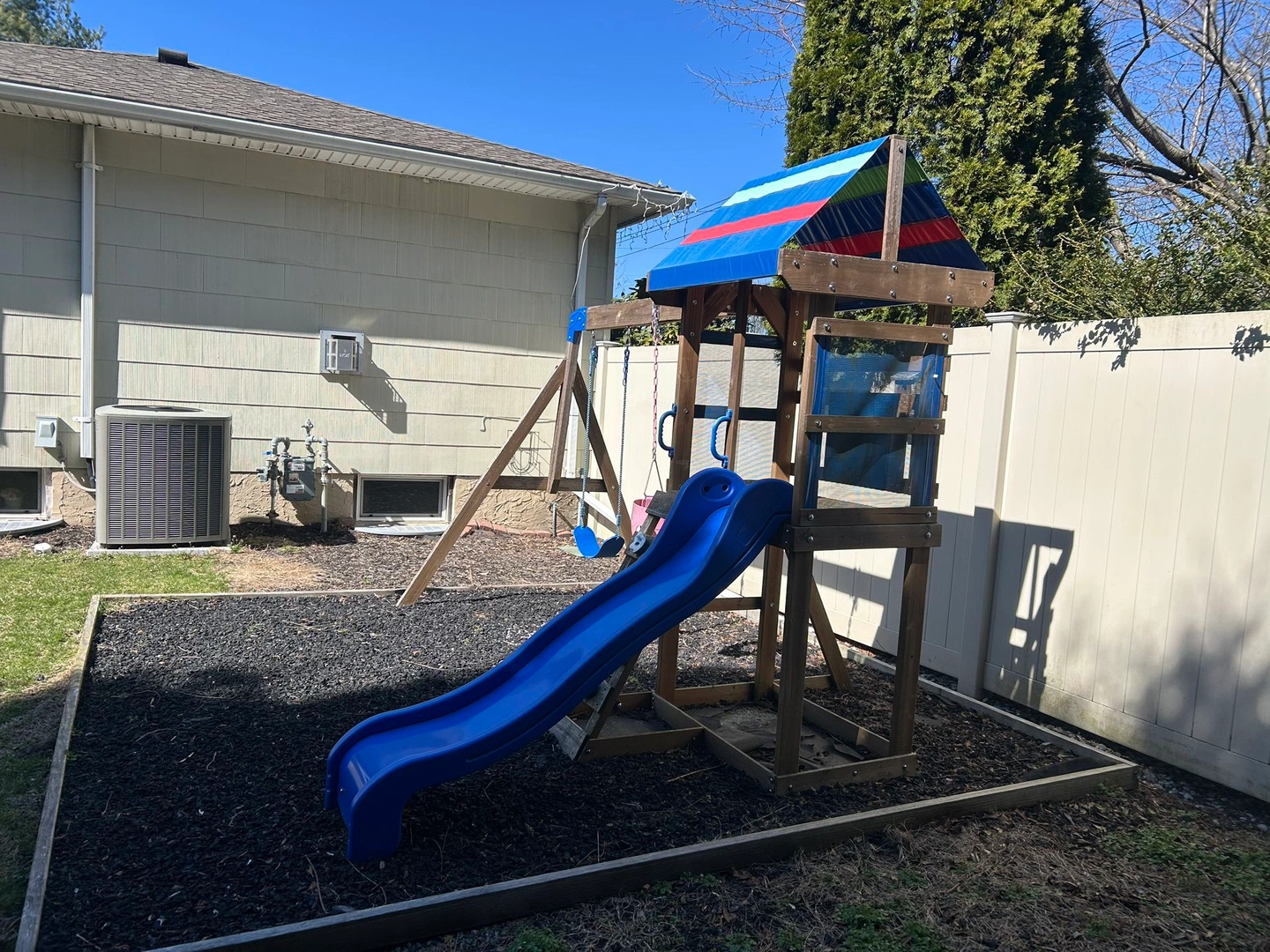 Turns backyard into adventure. The breezy upper play deck protected by a canopy roof. 2 classic belt swings with rope. 6 foot wave slide, 4 climbing holds. Brand: Backyard.