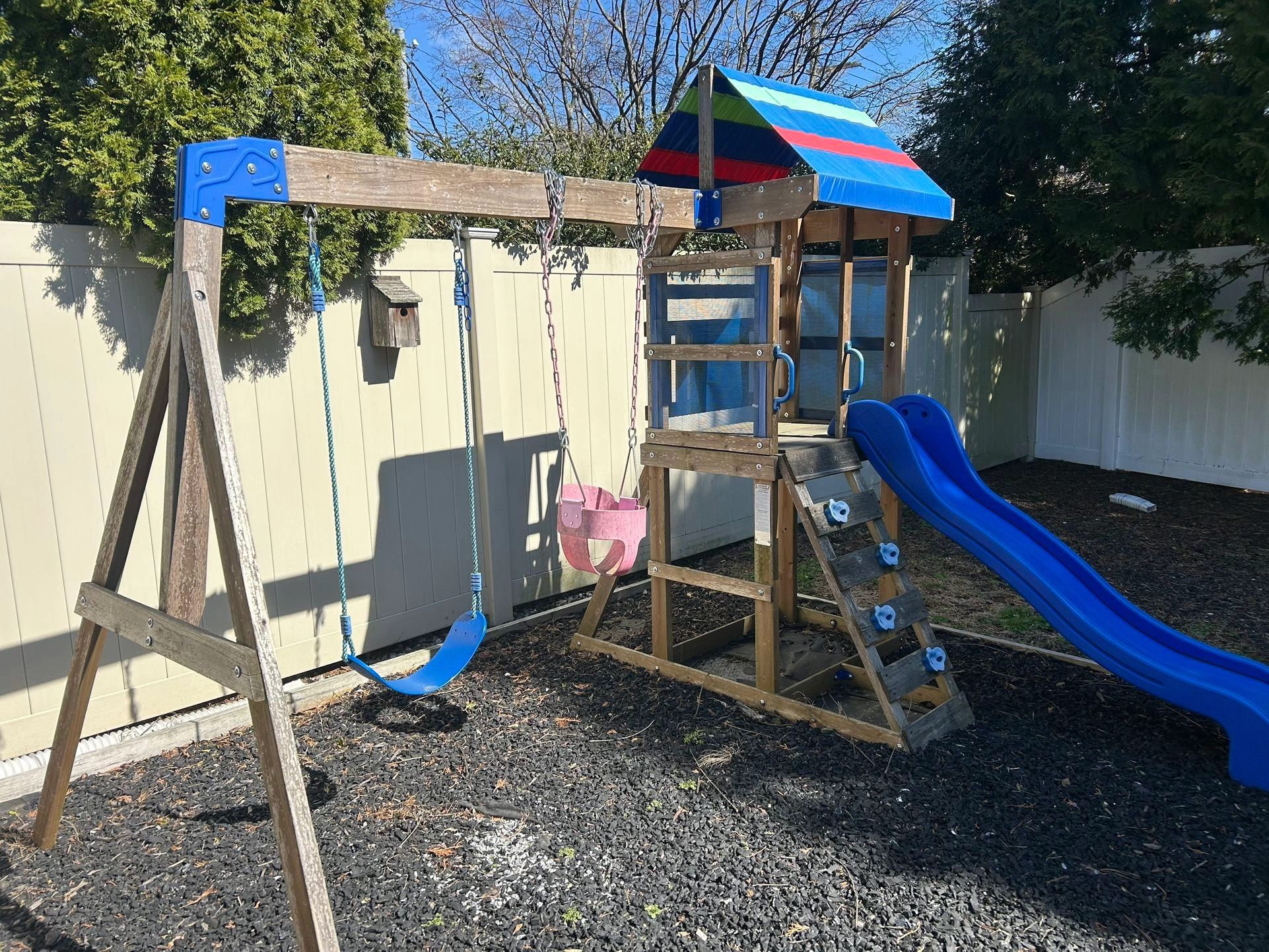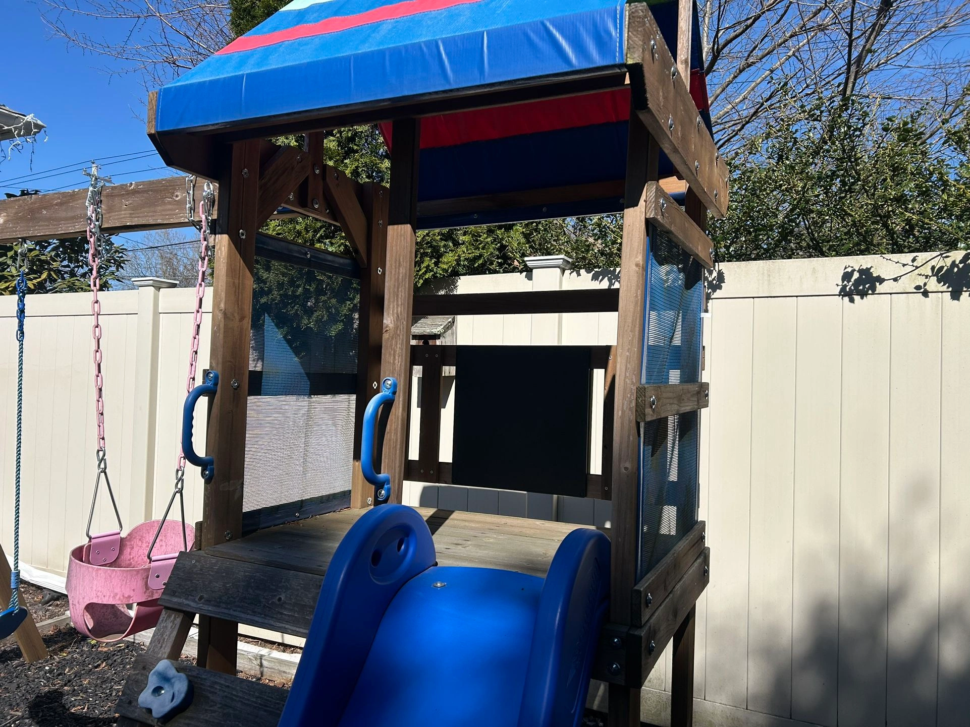 Turns backyard into adventure. The breezy upper play deck protected by a canopy roof. 2 classic belt swings with rope. 6 foot wave slide, 4 climbing holds. Brand: Backyard.