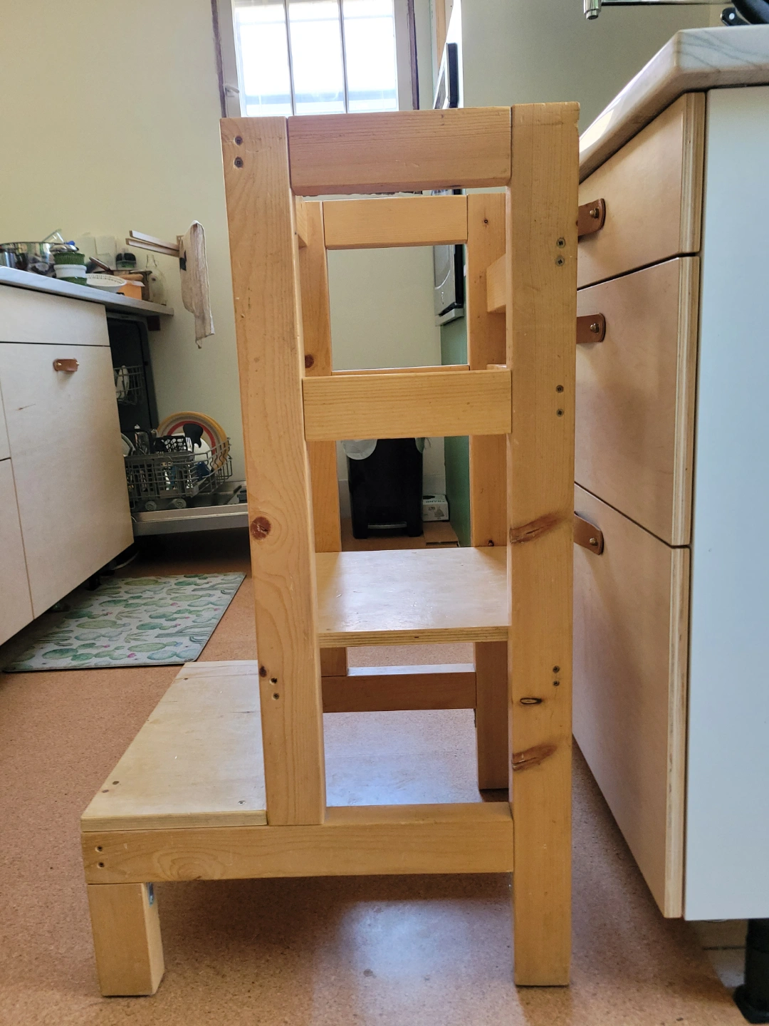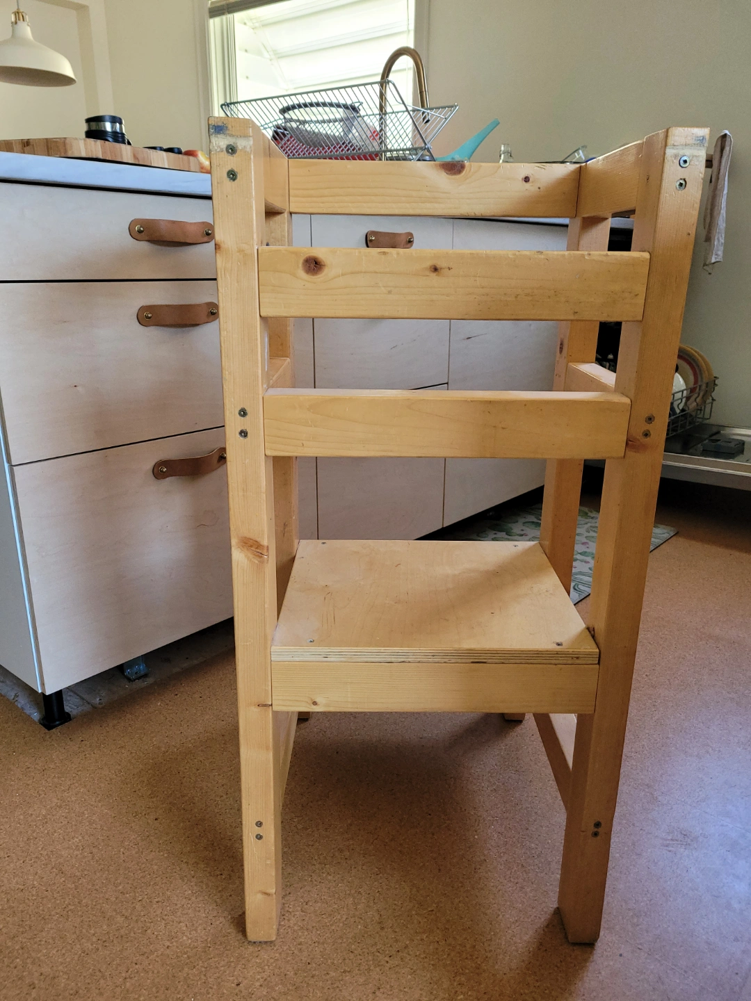 Sturdy learning tower. Two shelves. Perfect for helping in the kitchen. Light wood finish. Easy to clean.