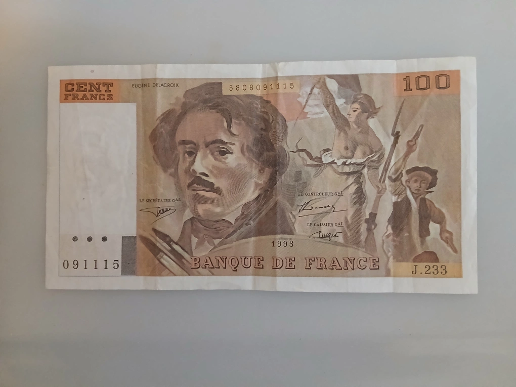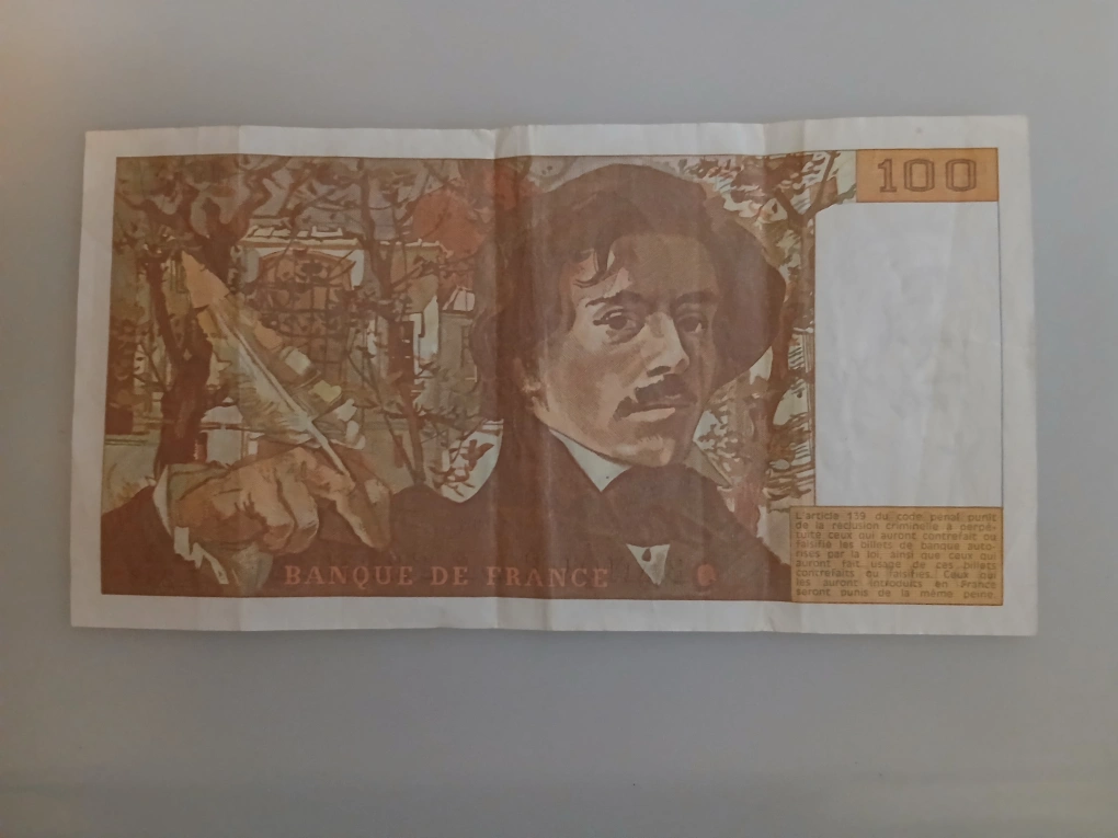 Vintage 100 French Franc banknote featuring a portrait of the painter Eugène Delacroix, issued by the Banque de France.