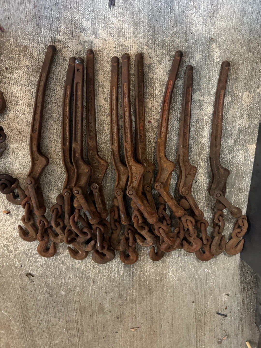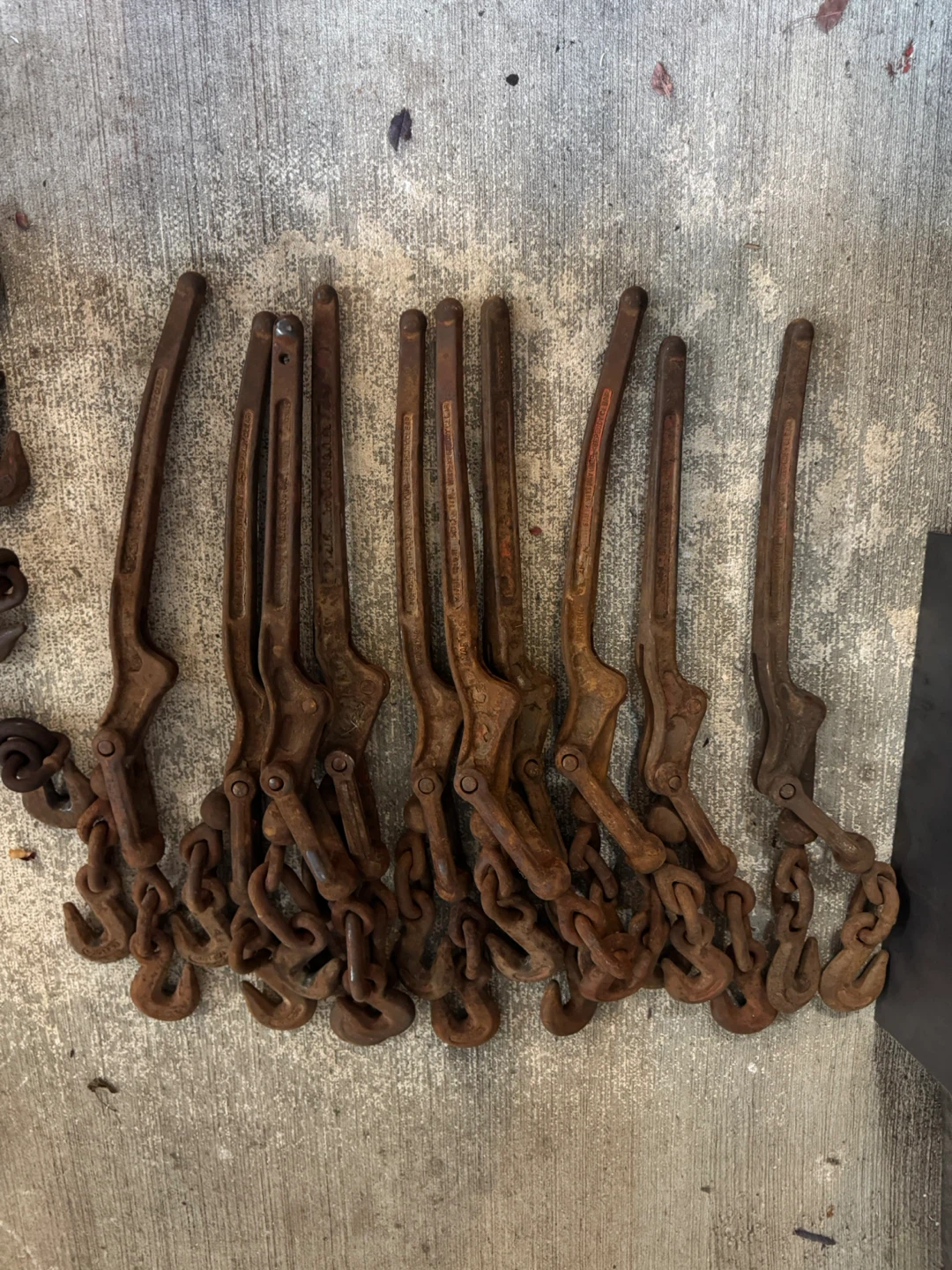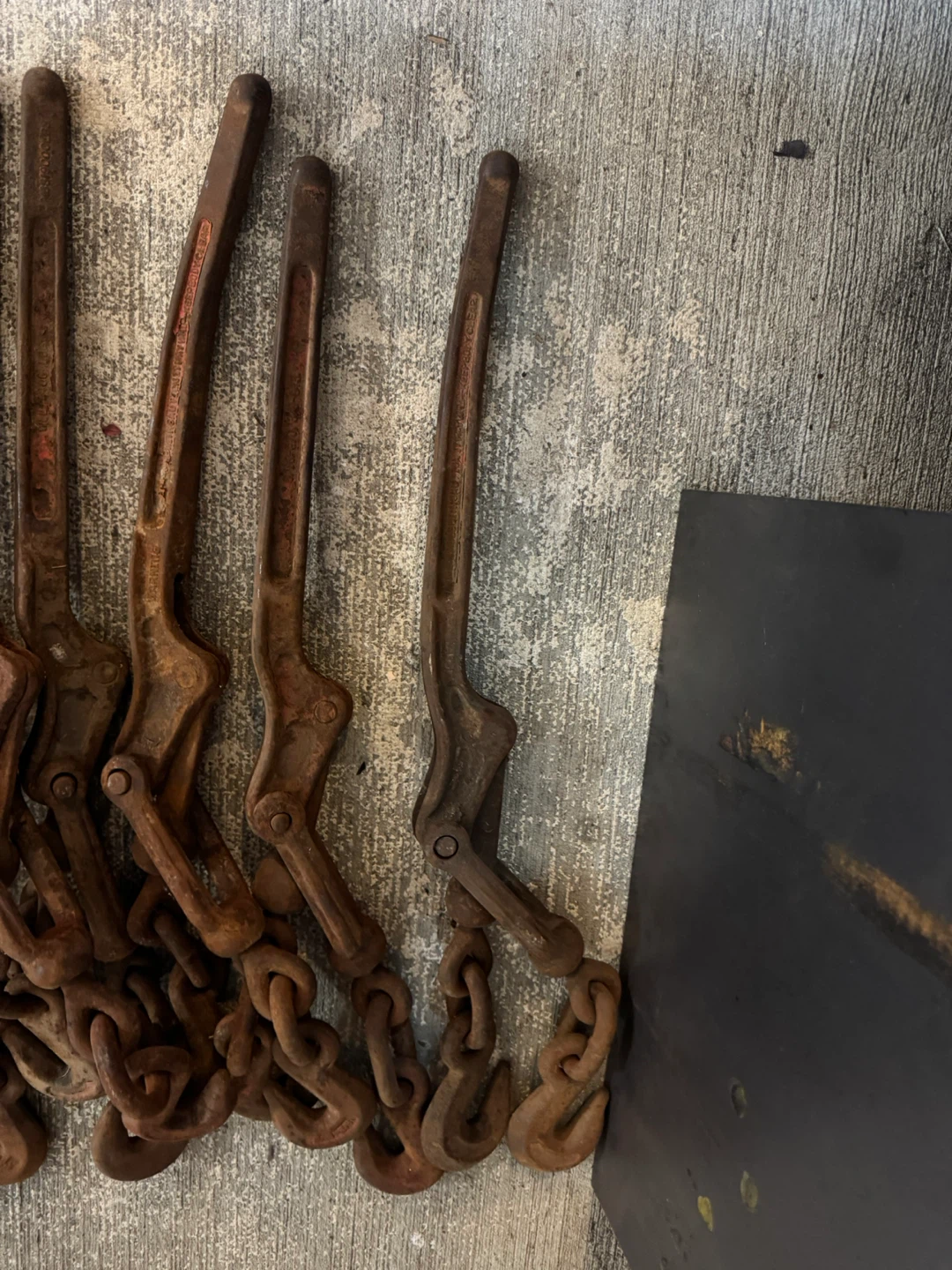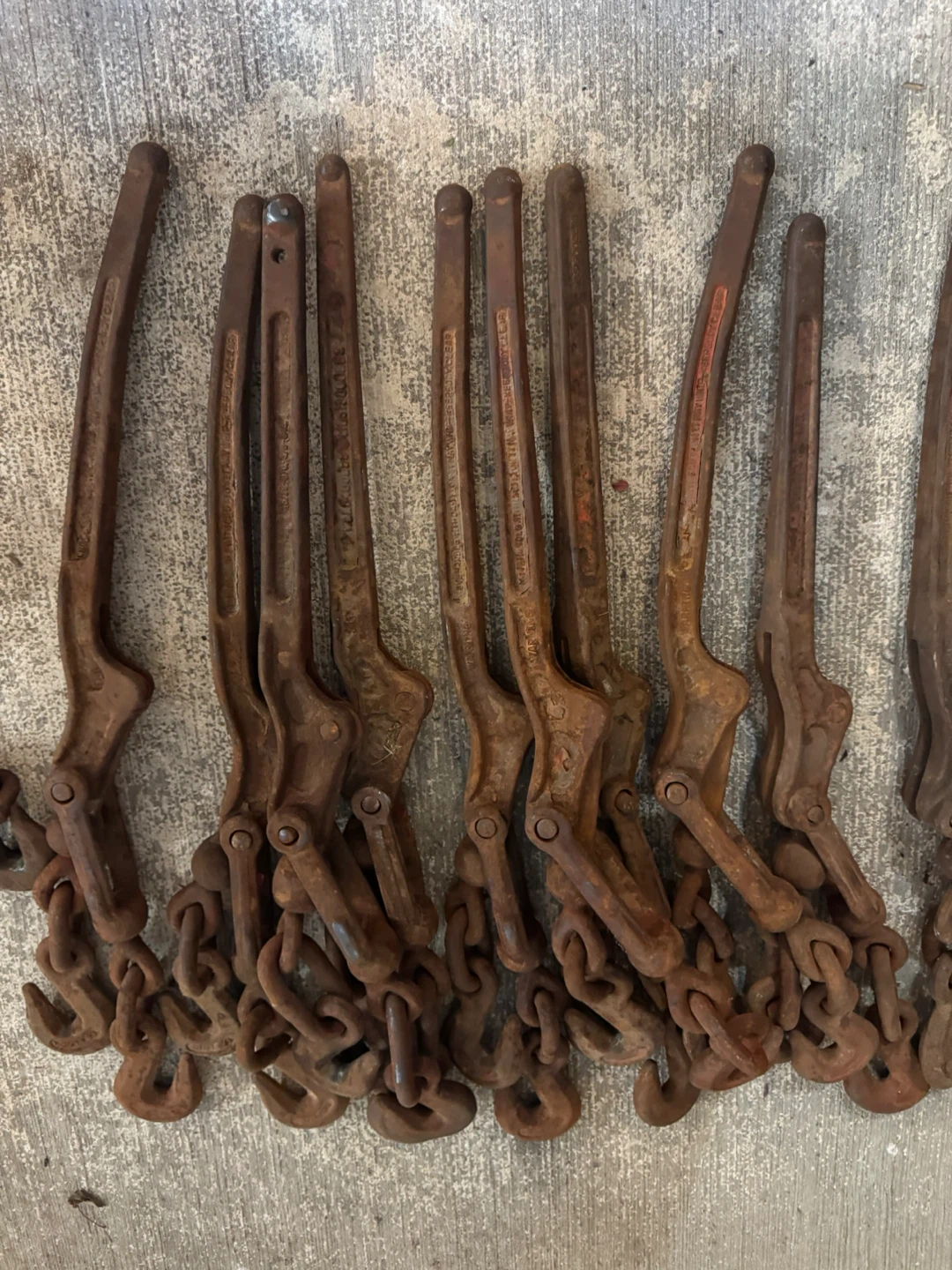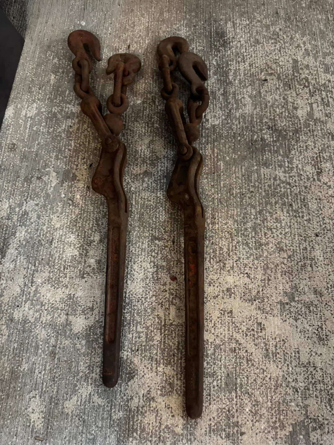 Selling 6 chain load binders, perfect for securing heavy loads. They show some signs of rust but are still functional and reliable. Ideal for construction, logging, or any heavy-duty hauling needs.