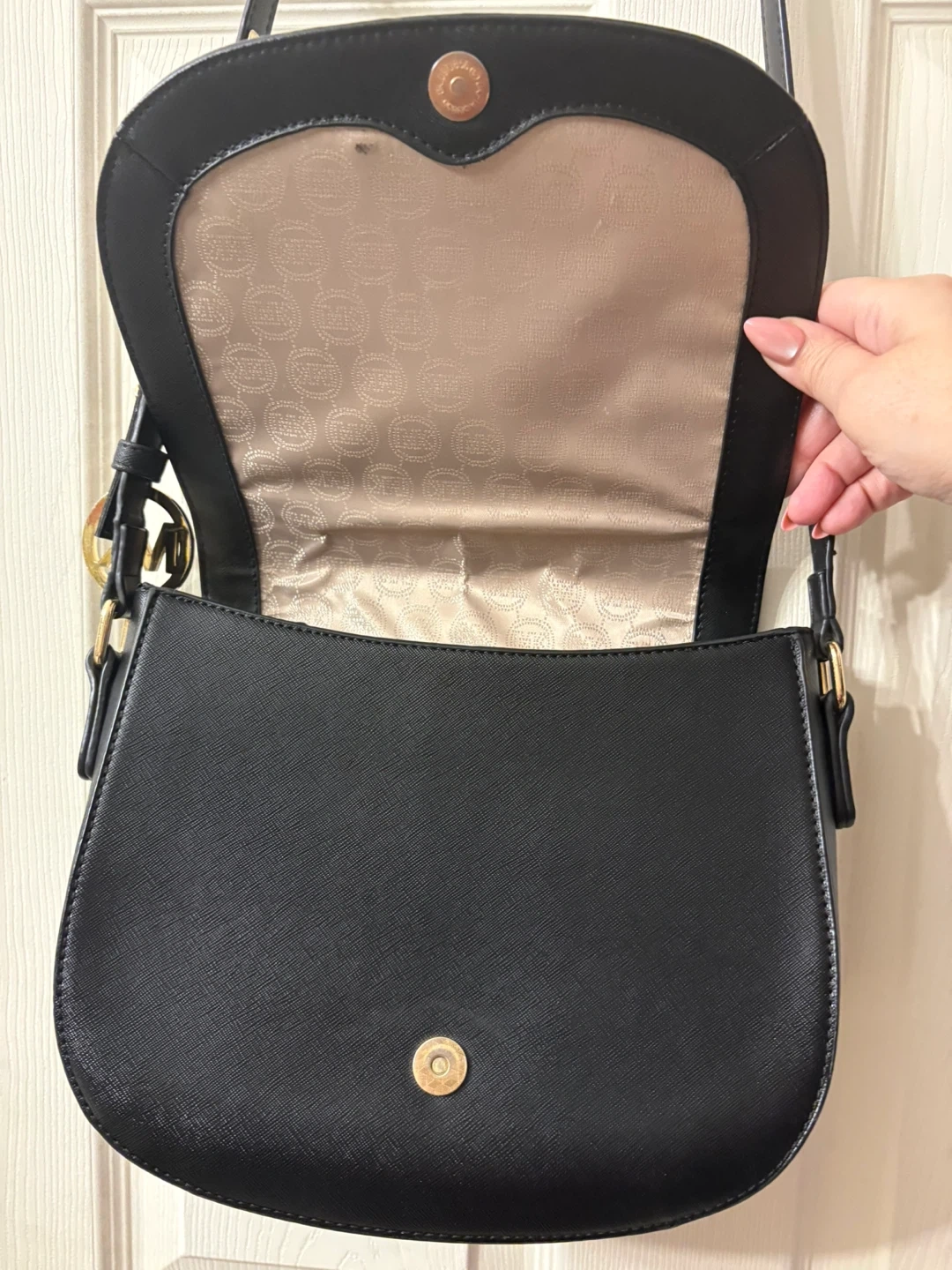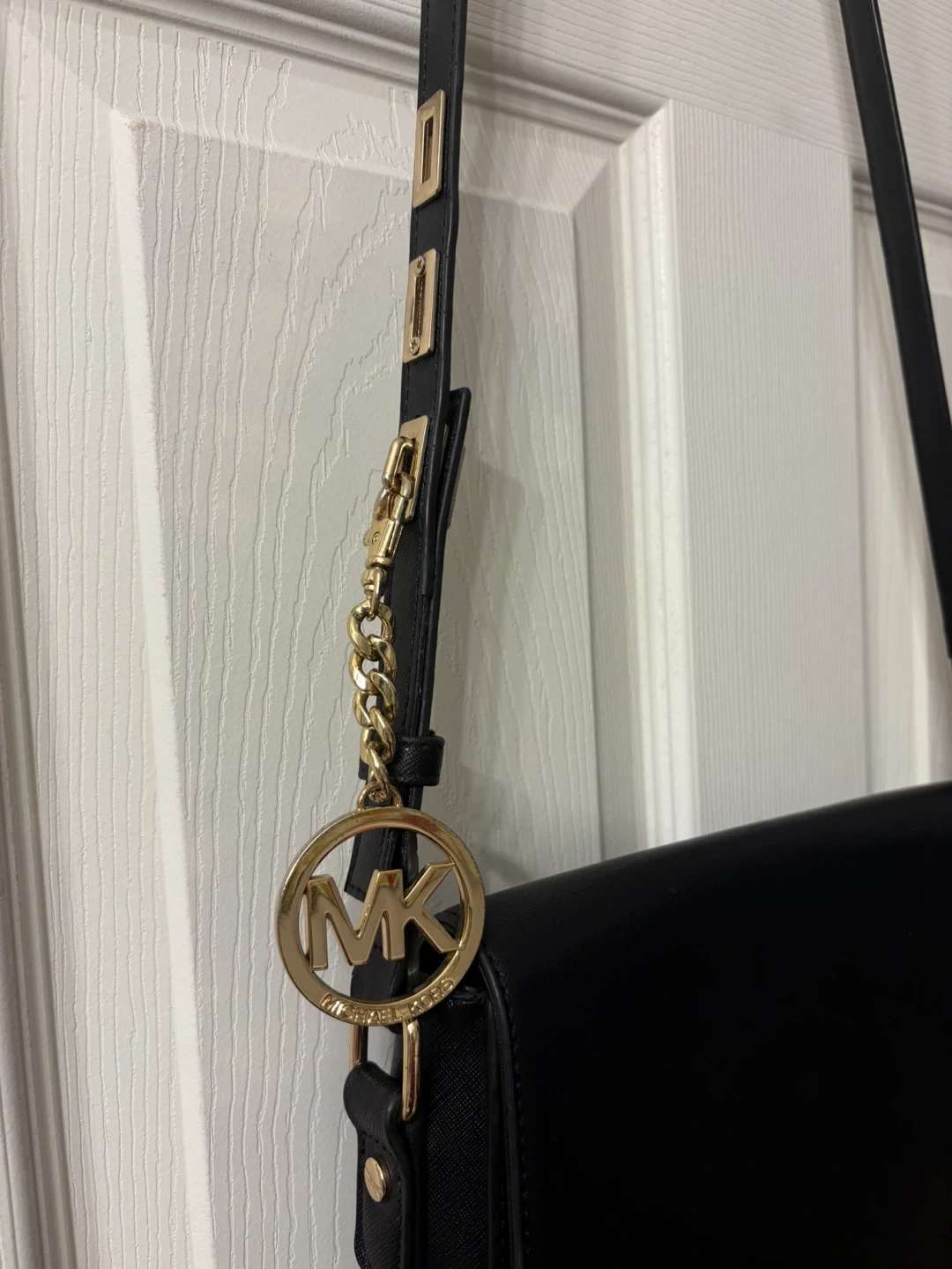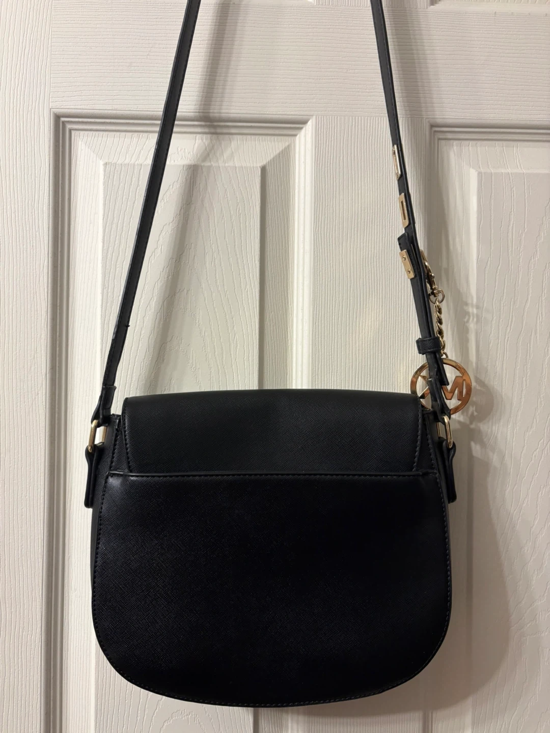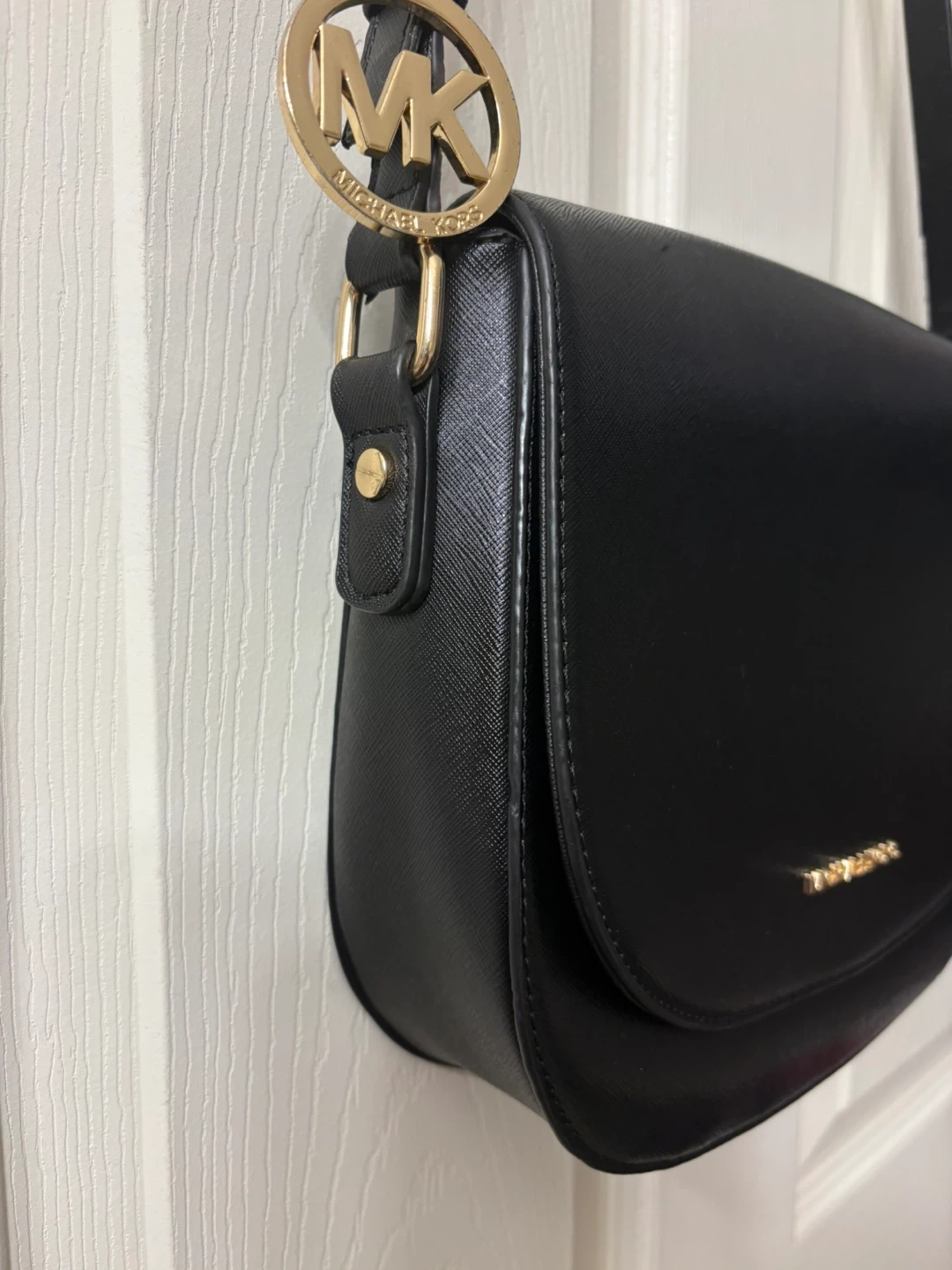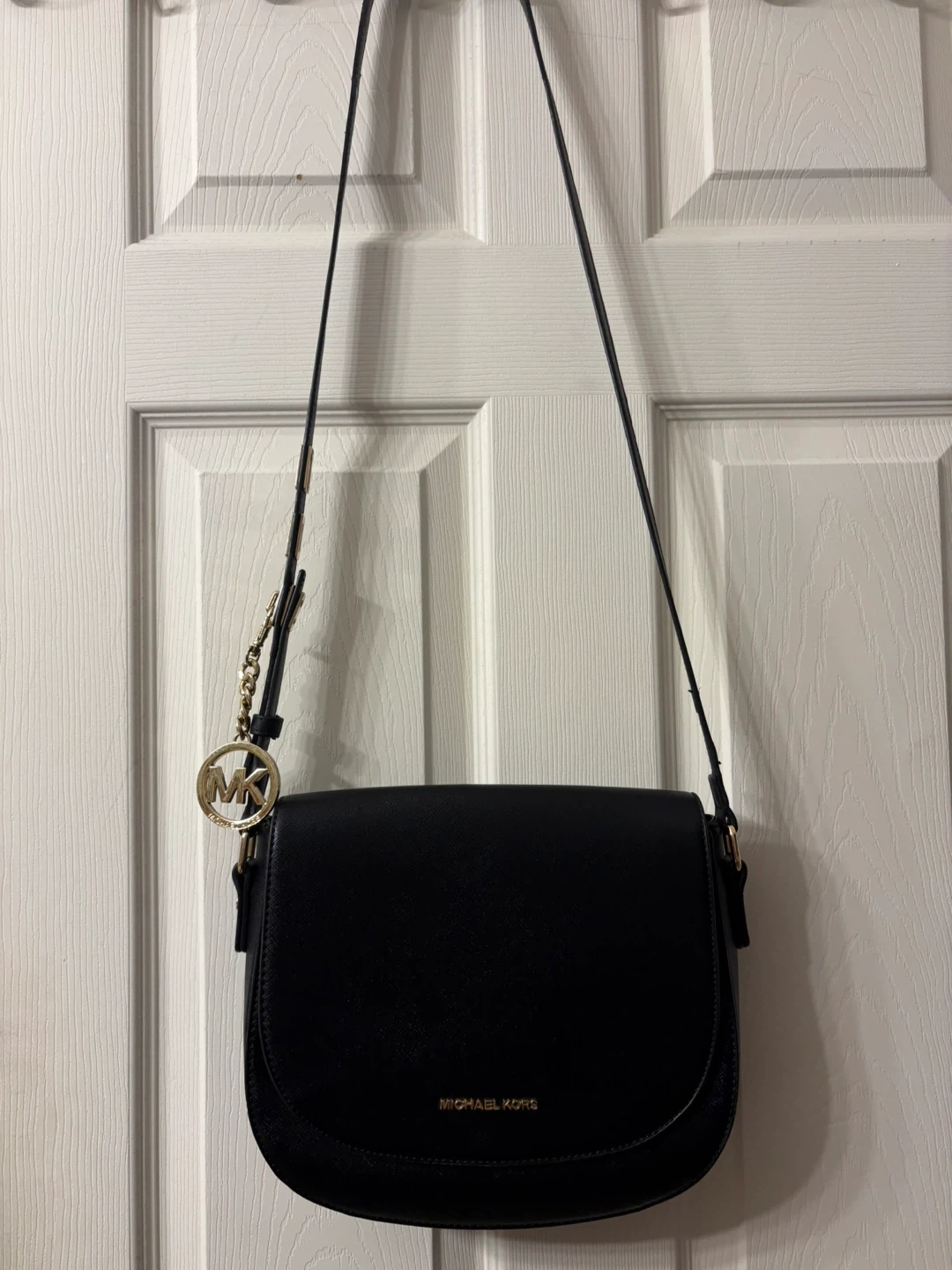 Chic black shoulder bag by Michael Kors. Features elegant gold accents. Adjustable strap, you can adjust the strap and secure the length with a beautiful MK charm, so original! The condition of the bag is “like new”, the strap has minimal signs of wear, almost unnoticeable. Saffiano leather material. Perfect for everyday style. Pick up in Chestermere.