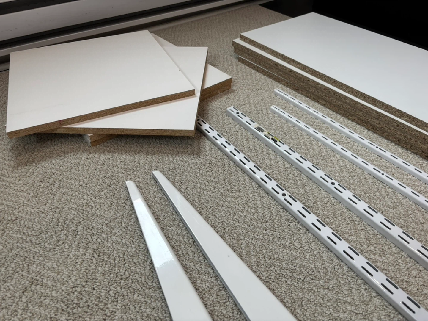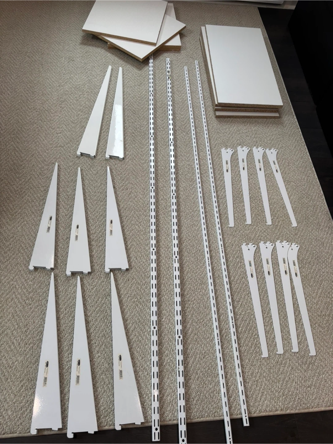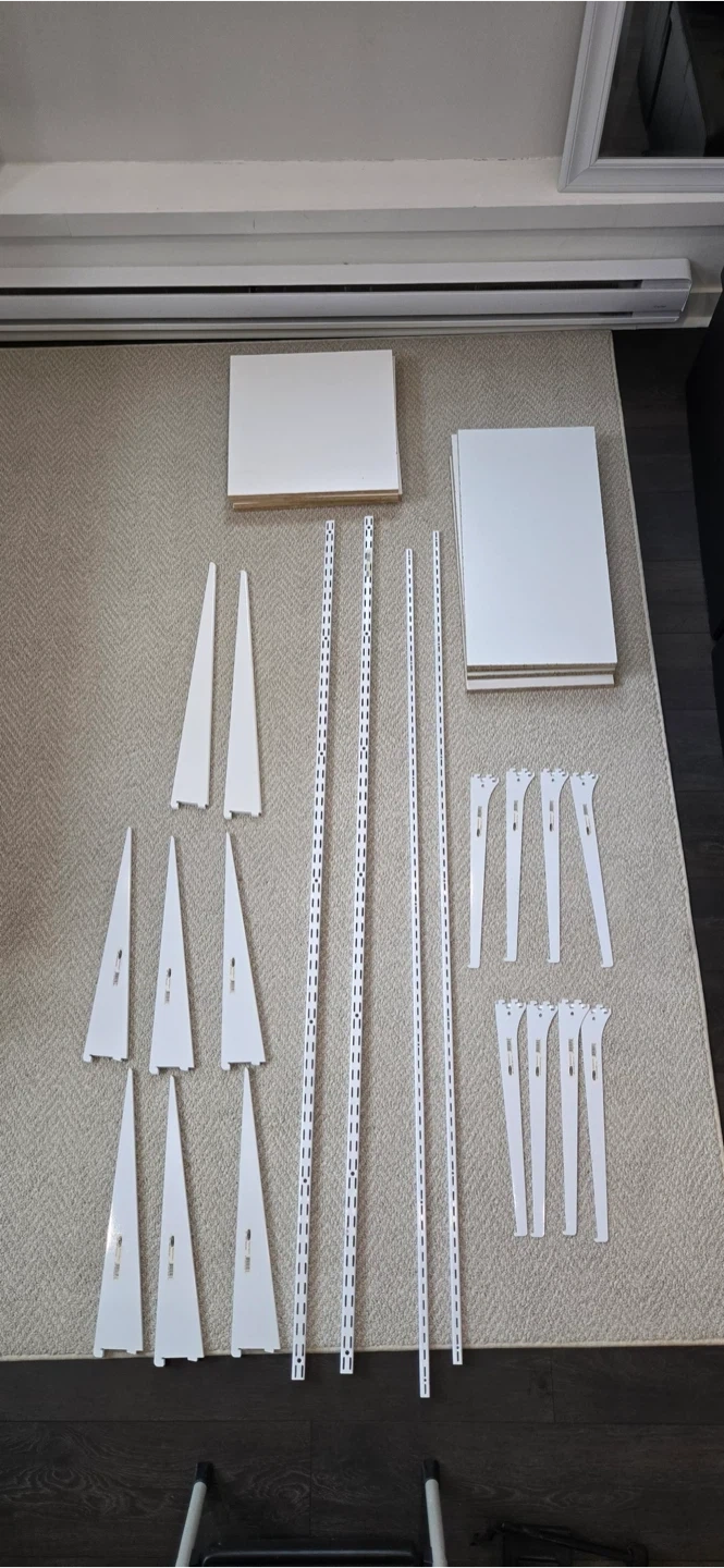 This is a set of Rubbermaid track shelving system and components. One UNI-track and One TWIN-track system.