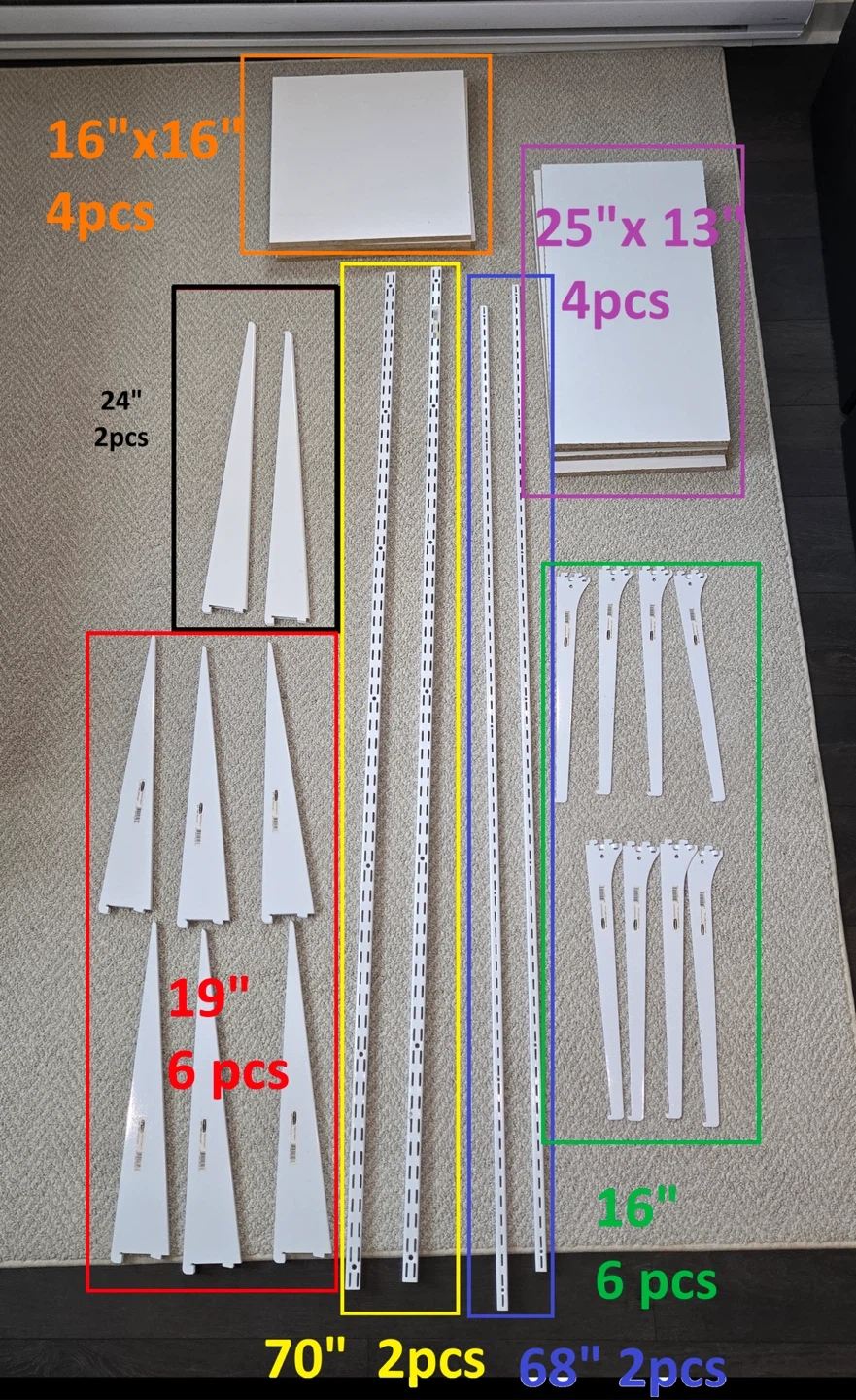 This is a set of Rubbermaid track shelving system and components. One UNI-track and One TWIN-track system.