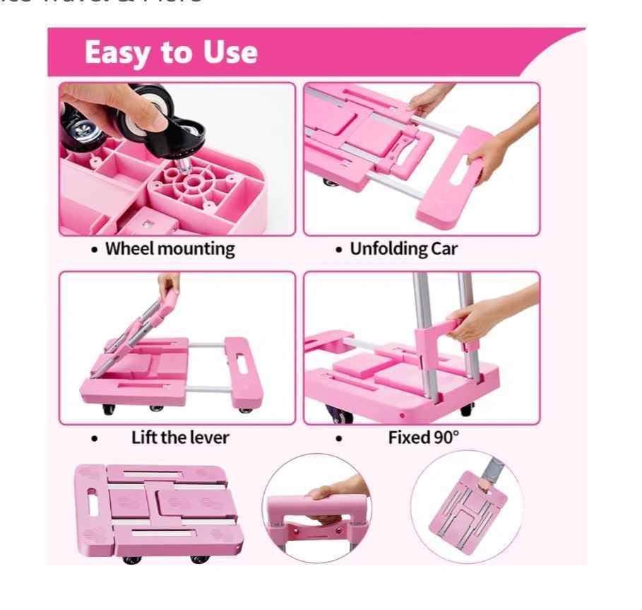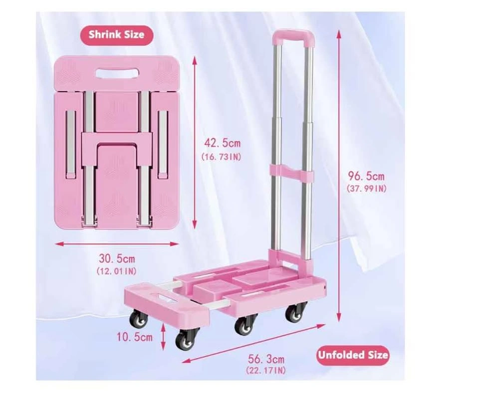Compact pink foldable hand truck. This dolly has a telescoping handle and thick pull rod. Includes two retaining straps for securing items. The board is retractable for easy storage. Has thick plastic sheet construction. Max capacity is 550 LBS.