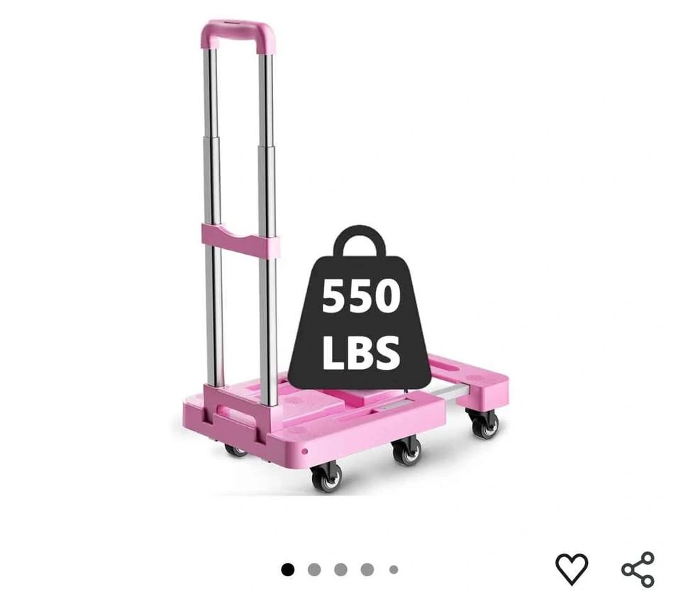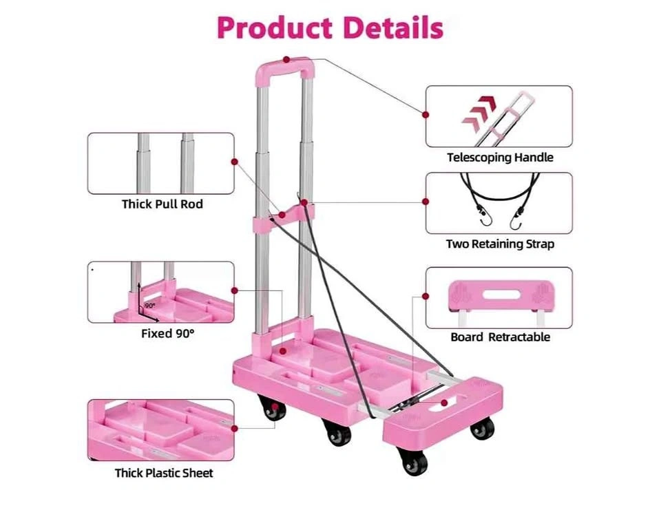 Compact pink foldable hand truck. This dolly has a telescoping handle and thick pull rod. Includes two retaining straps for securing items. The board is retractable for easy storage. Has thick plastic sheet construction. Max capacity is 550 LBS.