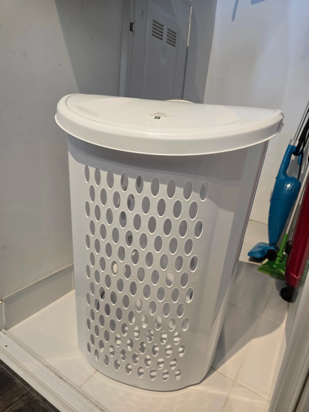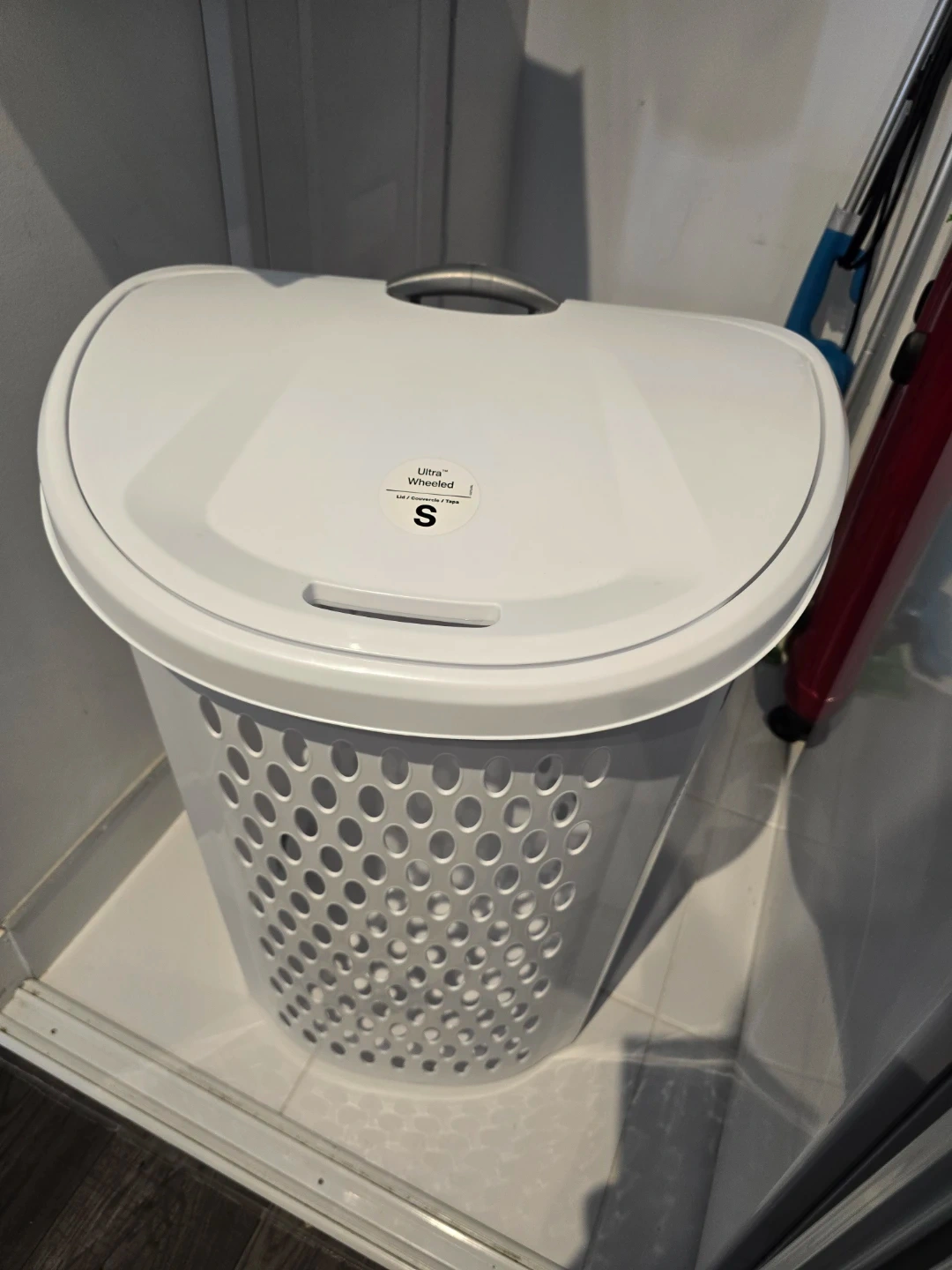 This Ultra Wheeled laundry hamper is a small size. It has a lid and wheels for easy transport. The perforated design allows for ventilation.
