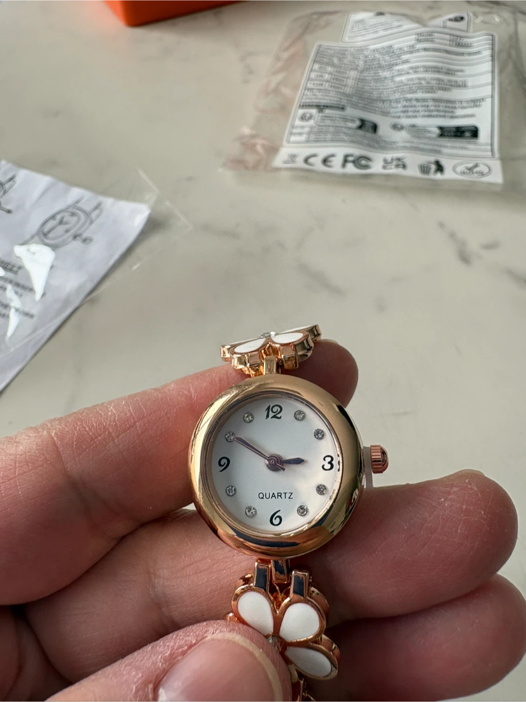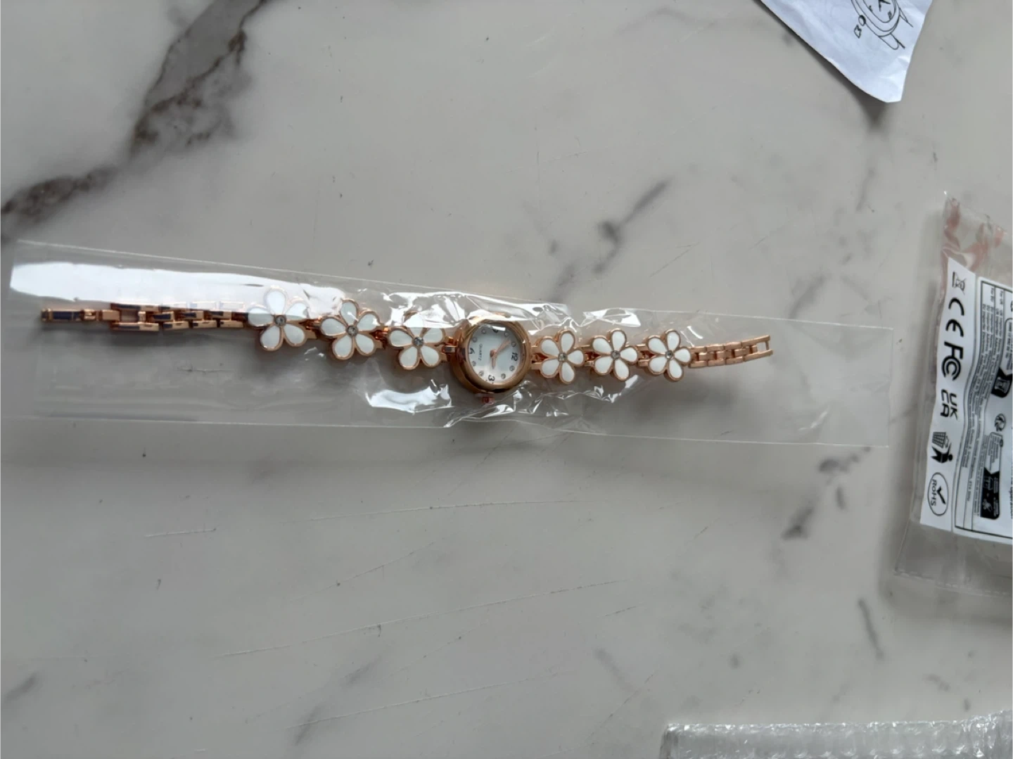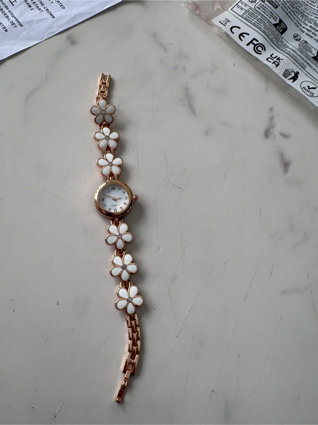 Elegant rose gold women’s watch with floral bracelet details. Slim and stylish design, perfect for everyday wear or special occasions. The bracelet features flower-shaped links with small stone accents.