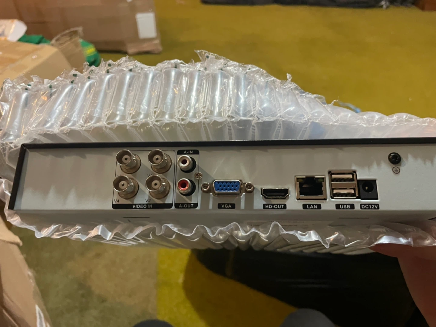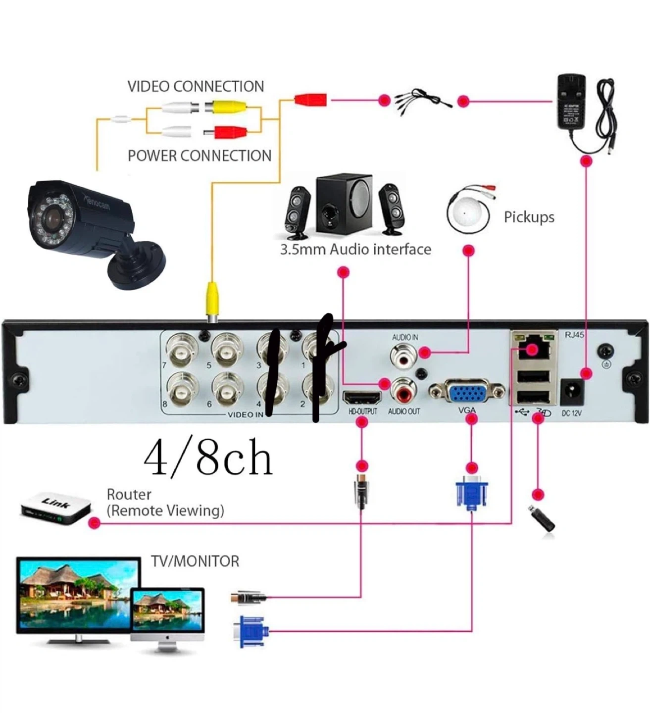 This Xenocam DVR security system supports 4 or 8 channels. It includes multiple video input and output options, including VGA and HD-OUT. USB and LAN ports are available for connectivity. Power is supplied via DC 12V.