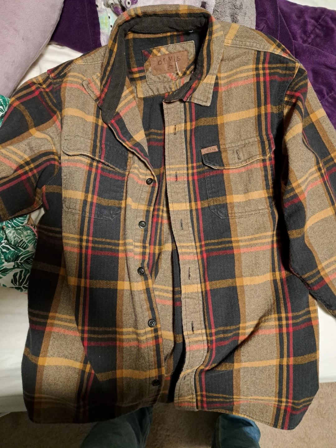 Orvis plaid flannel shirt with button-up front. It's a classic casual shirt for cooler weather. Perfect for layering.