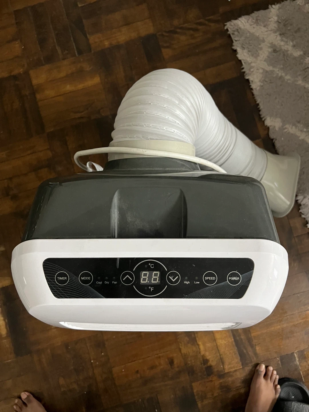 This is a SereneLife portable air conditioner unit. It has a digital display with timer, mode, speed, and power controls. Includes exhaust hose and window kit. Has a remote as well.