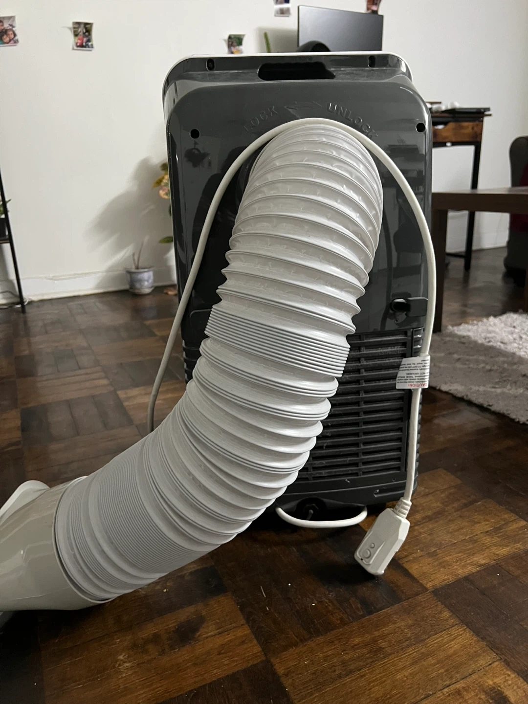 This is a SereneLife portable air conditioner unit. It has a digital display with timer, mode, speed, and power controls. Includes exhaust hose and window kit. Has a remote as well.