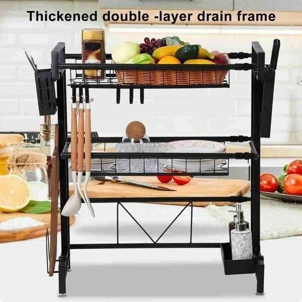 This black dish rack offers two tiers for drying dishes and kitchenware. It's made of metal and includes a utensil holder and knife block. The width is adjustable from 60cm to 100cm, and the height is 72cm.