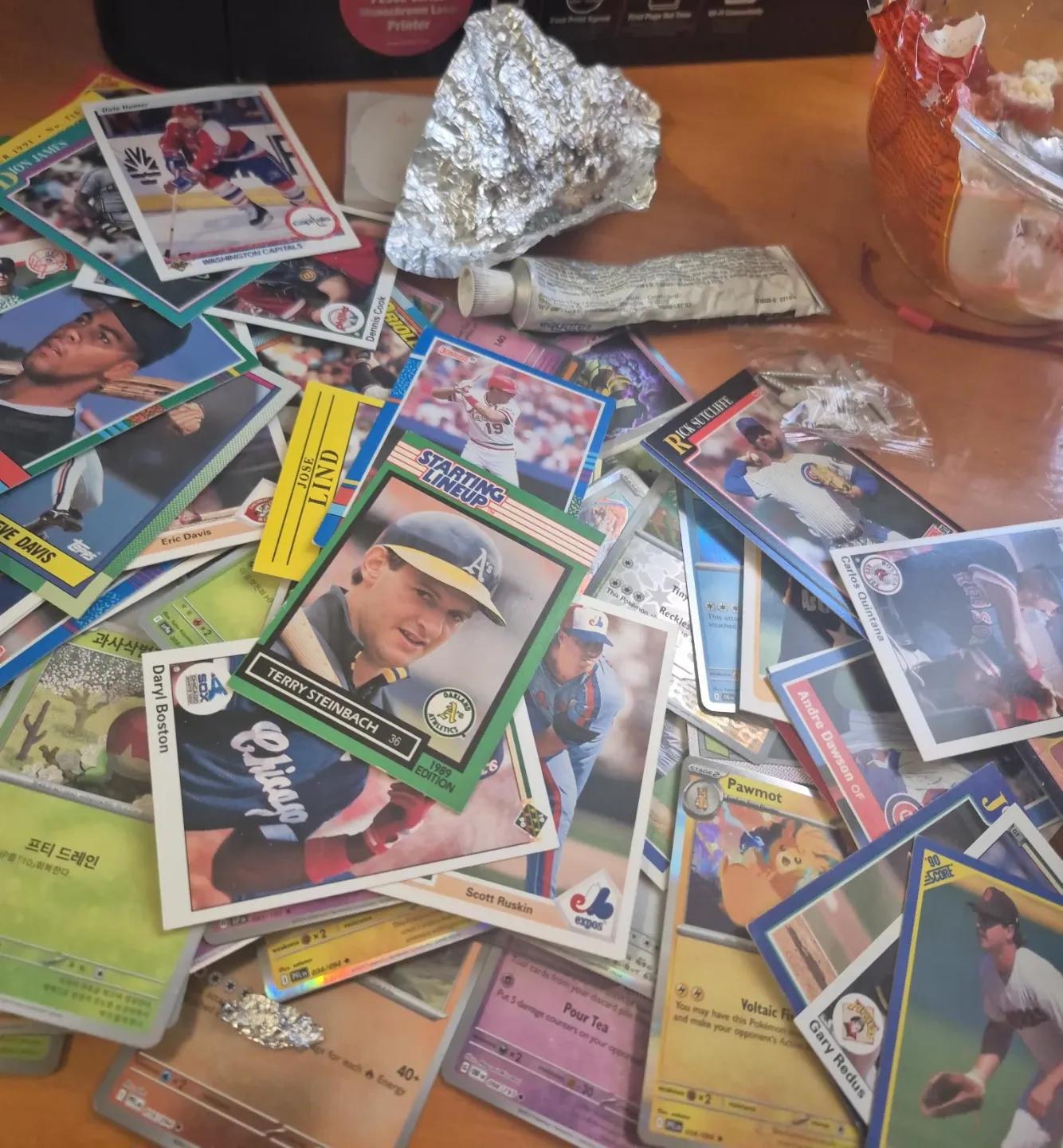 This is a collection of various baseball cards featuring players like Terry Steinbach and Dion James, alongside some Pokémon cards such as Pawmot. These cards are from different sets and years. They'd be a fun addition for any collector.