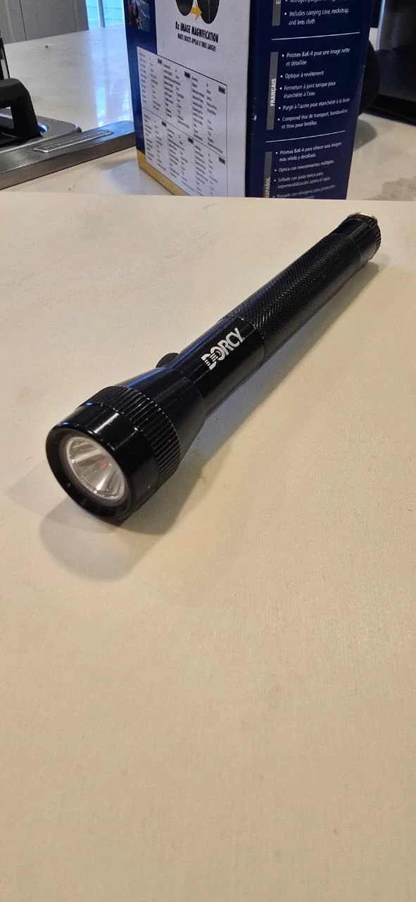 Selling a Dorcy flashlight! It includes a carrying case, neckstrap, and lens cloth. It features prisms Bak-4 for a clear and detailed image and optics with coating.the lamp needs to be replaced.