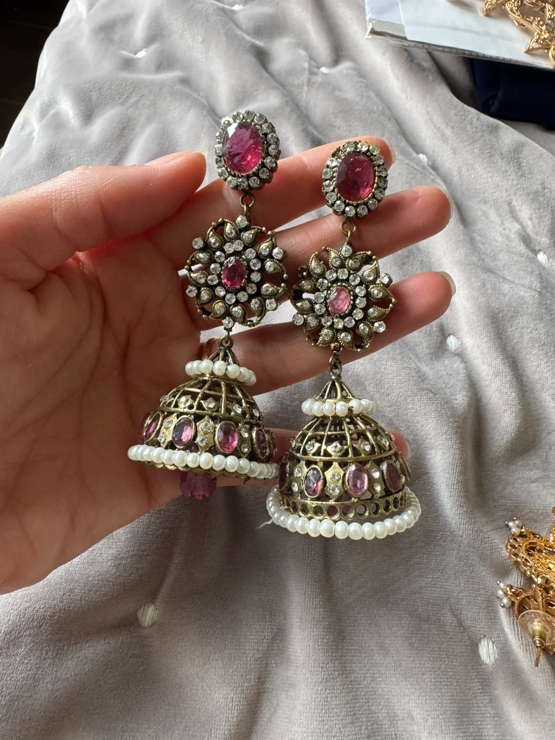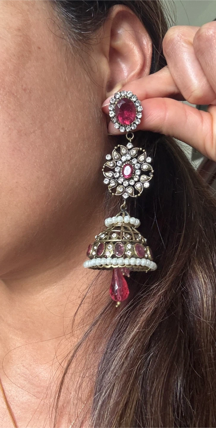 These beautiful jhumka earrings feature intricate detailing with red and clear stones, accented with small pearls. The design includes a bell-shaped base, perfect for adding a touch of elegance to any traditional or festive outfit. They're made with metal and adorned with faux gems and pearls.